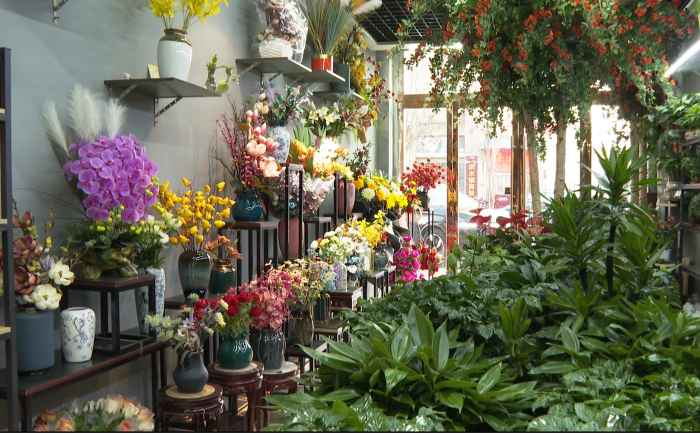 不止花卉大棚,城区的各色鲜花店更是暖意融融、热闹非凡。走进鲜花店,满目鲜活色彩瞬间驱散了冬日寒意,君子兰叶片舒展挺拔,发财树枝繁叶茂,香槟玫瑰温柔雅致,百合花散发着淡淡清香,雪柳枝条轻垂、缀满星点白花,满眼亮色让人恍若置身春日花园。鲜花店工作人员正忙着修剪花枝、搭配花材、打包花束,将一束束娇艳的鲜花装进精美礼盒,为顾客送去冬日里的浪漫与生机。