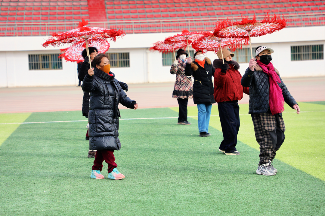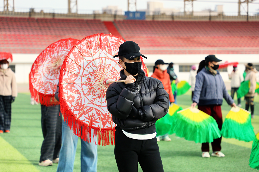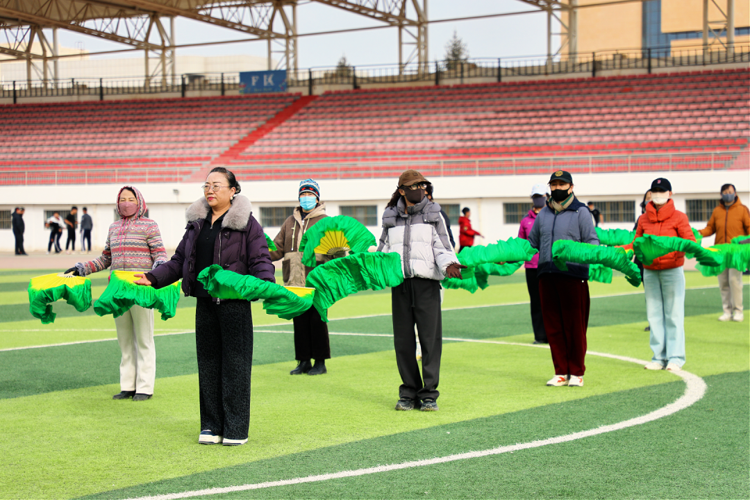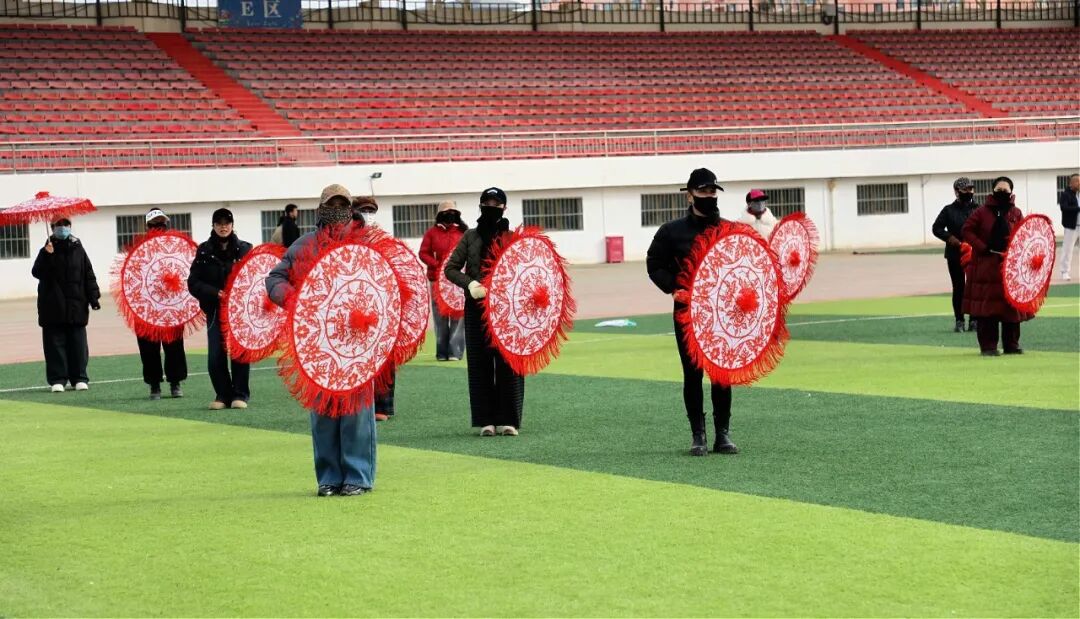 记者刚走进金昌市体育场,就被眼前的热闹场景吸引——八十余人的秧歌队在绿草坪上列阵排练,红色剪纸油纸伞上下翻飞,绿黄渐变的彩扇在冬日里拧出一团团暖意。