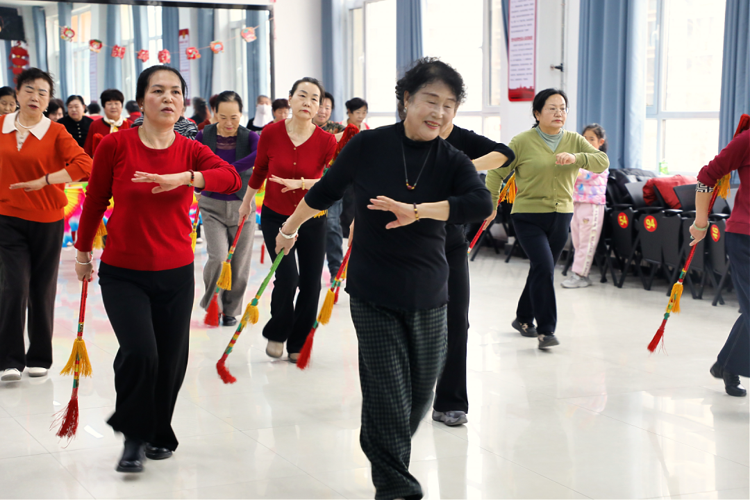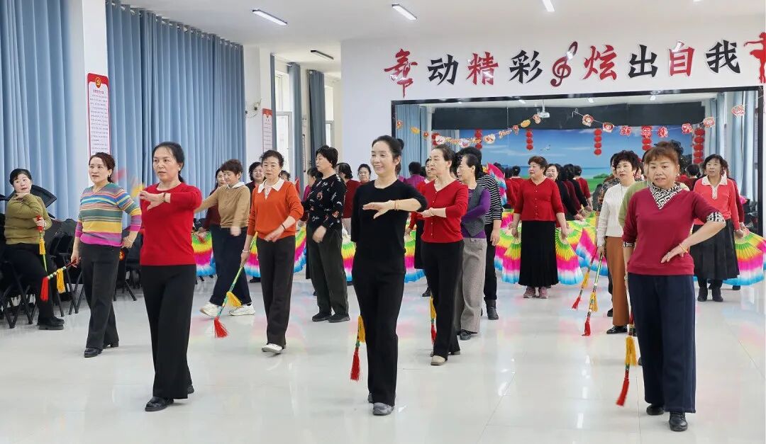 在广州路街道的社区活动室内,另一番热闹景象正在上演。队员们手持一米长的霸王鞭,随着节奏敲击身体,铜钱碰撞的清脆响声与欢笑声交织成独特的韵律。