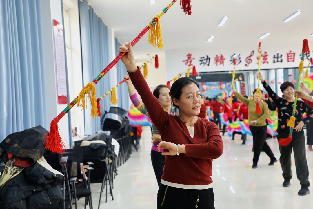 退休后才开始参加社火表演的薛梅,手中的霸王鞭舞得虎虎生风。“过年社火必不可少。也是我们新年的一种热闹氛围。”她笑着说道。活动室墙上“舞动精彩 炫出自我”的标语,正是这群基层群众精神面貌的生动写照。