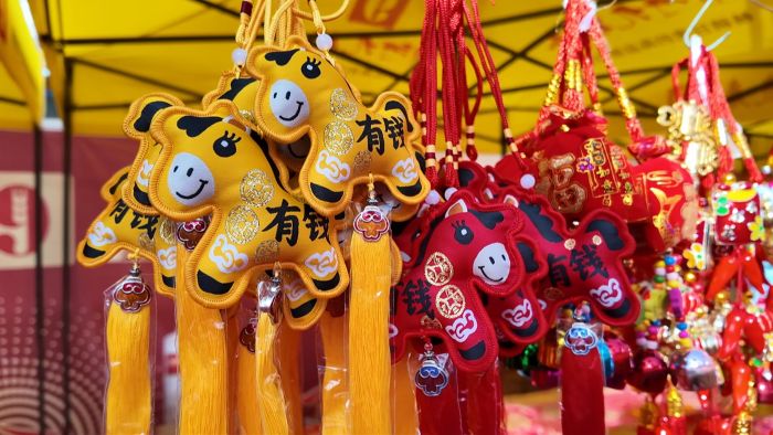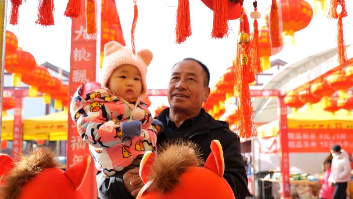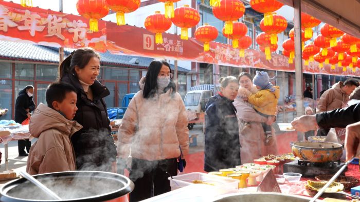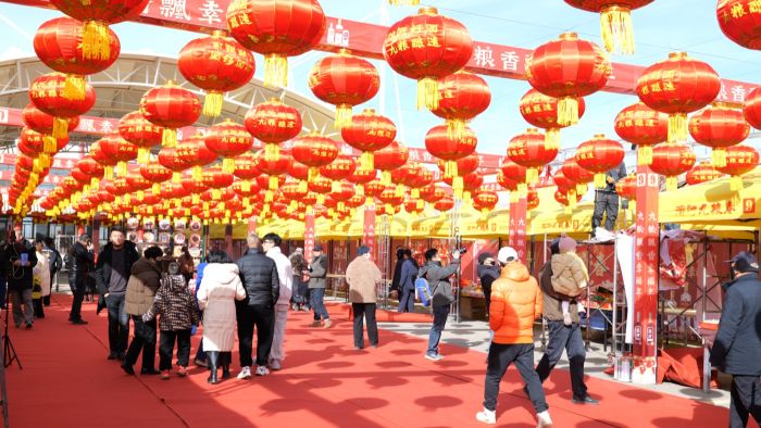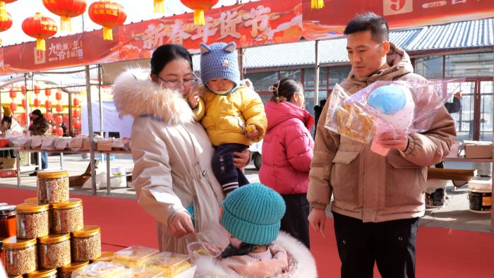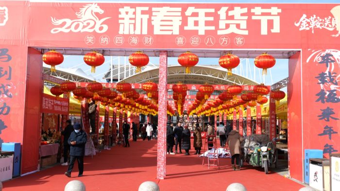 年货节现场,165个摊位整齐排开,对联、年画、文创产品、非遗好物、干果小吃等各类年货琳琅满目,令人目不暇接。