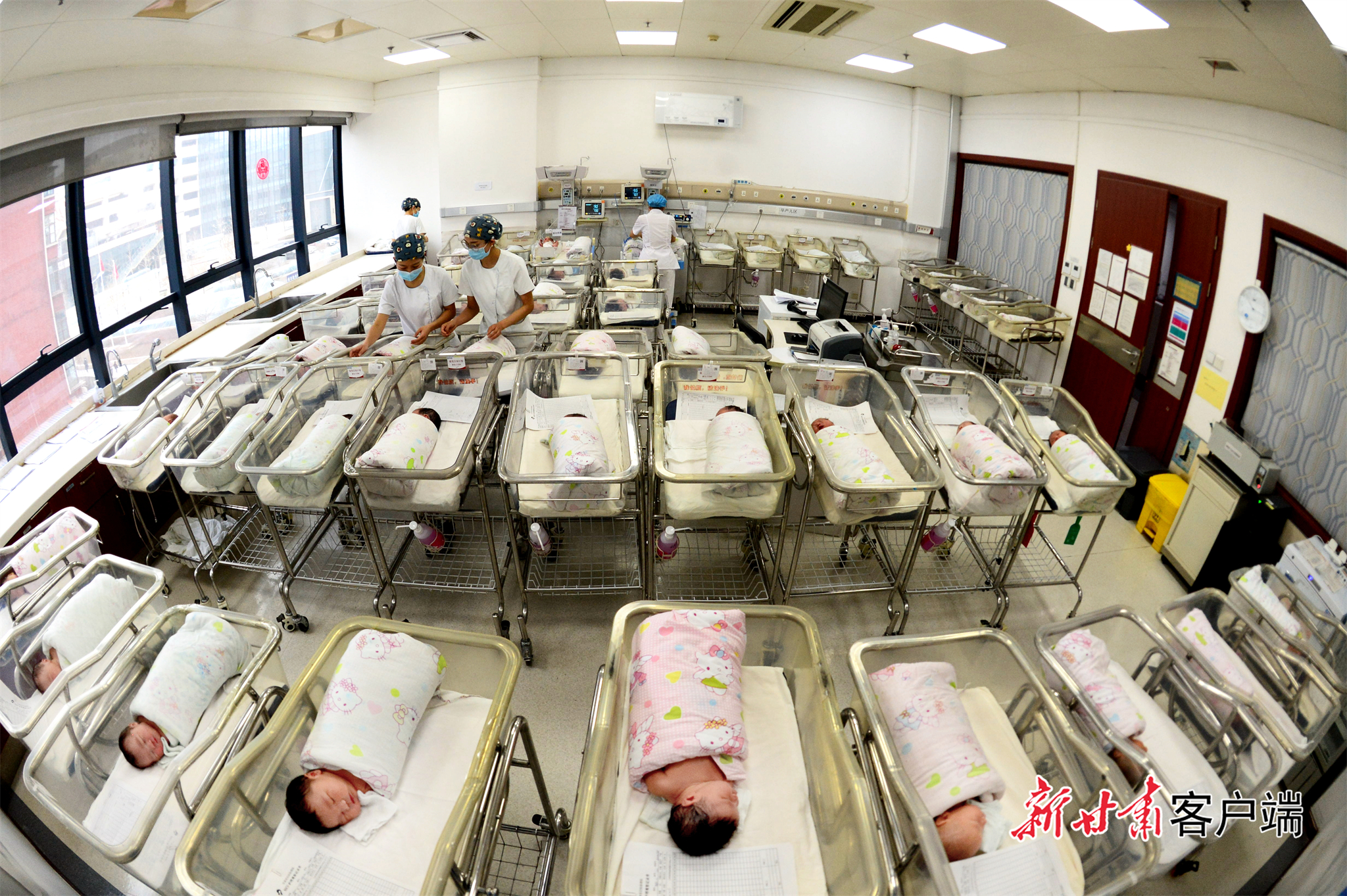 省妇幼产科医护人员照顾刚出生的婴儿。