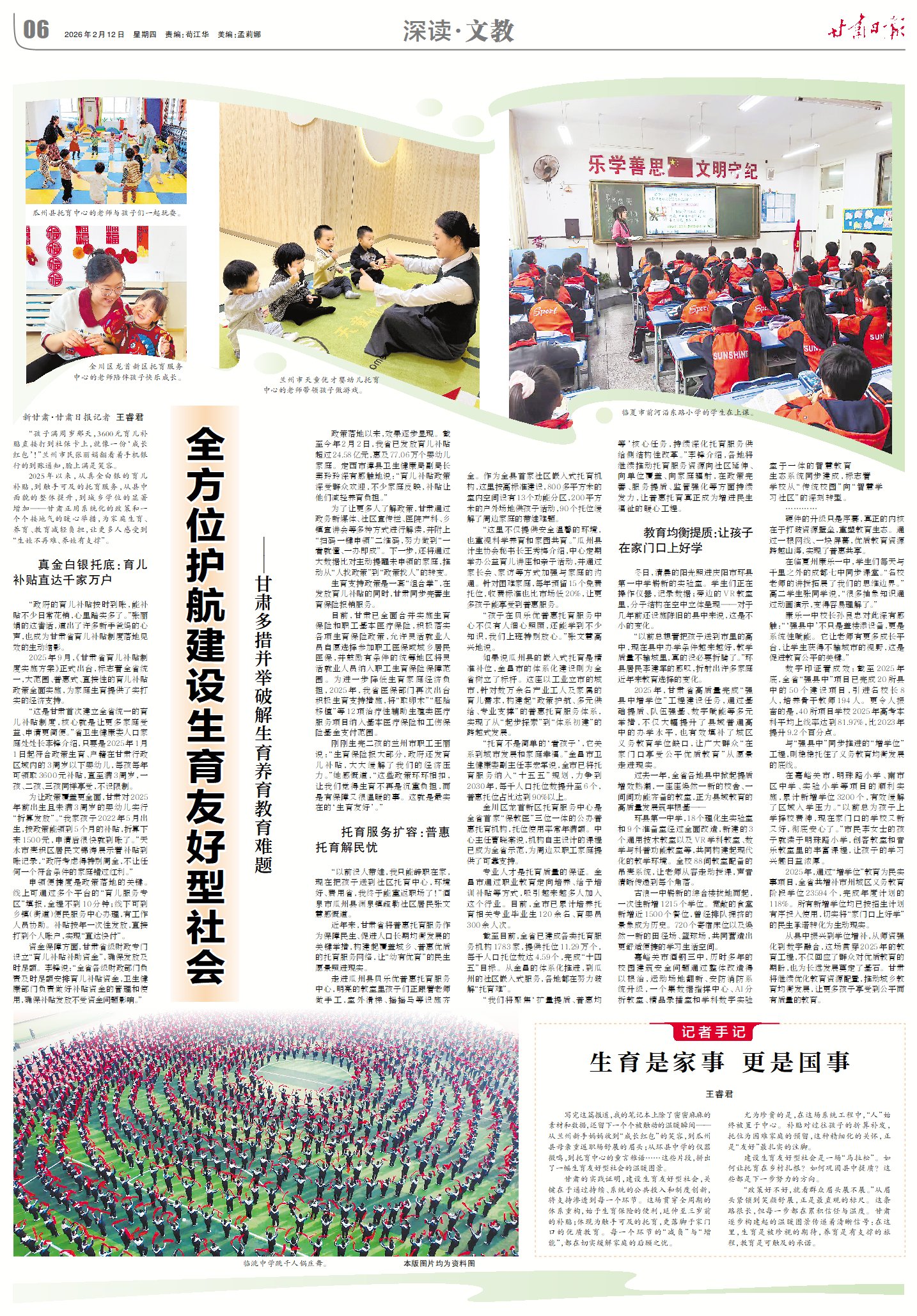 写完这篇报道,我的笔记本上除了密密麻麻的素材和数据,还留下一个个被触动的温暖瞬间——从兰州新手妈妈收到“成长红包”的笑容,到瓜州县母亲重返职场舒展的眉头;从环县中学的仪器微鸣,到托育中心的童言稚语……这些片段,拼出了一幅“生育友好型社会”的温暖图景。