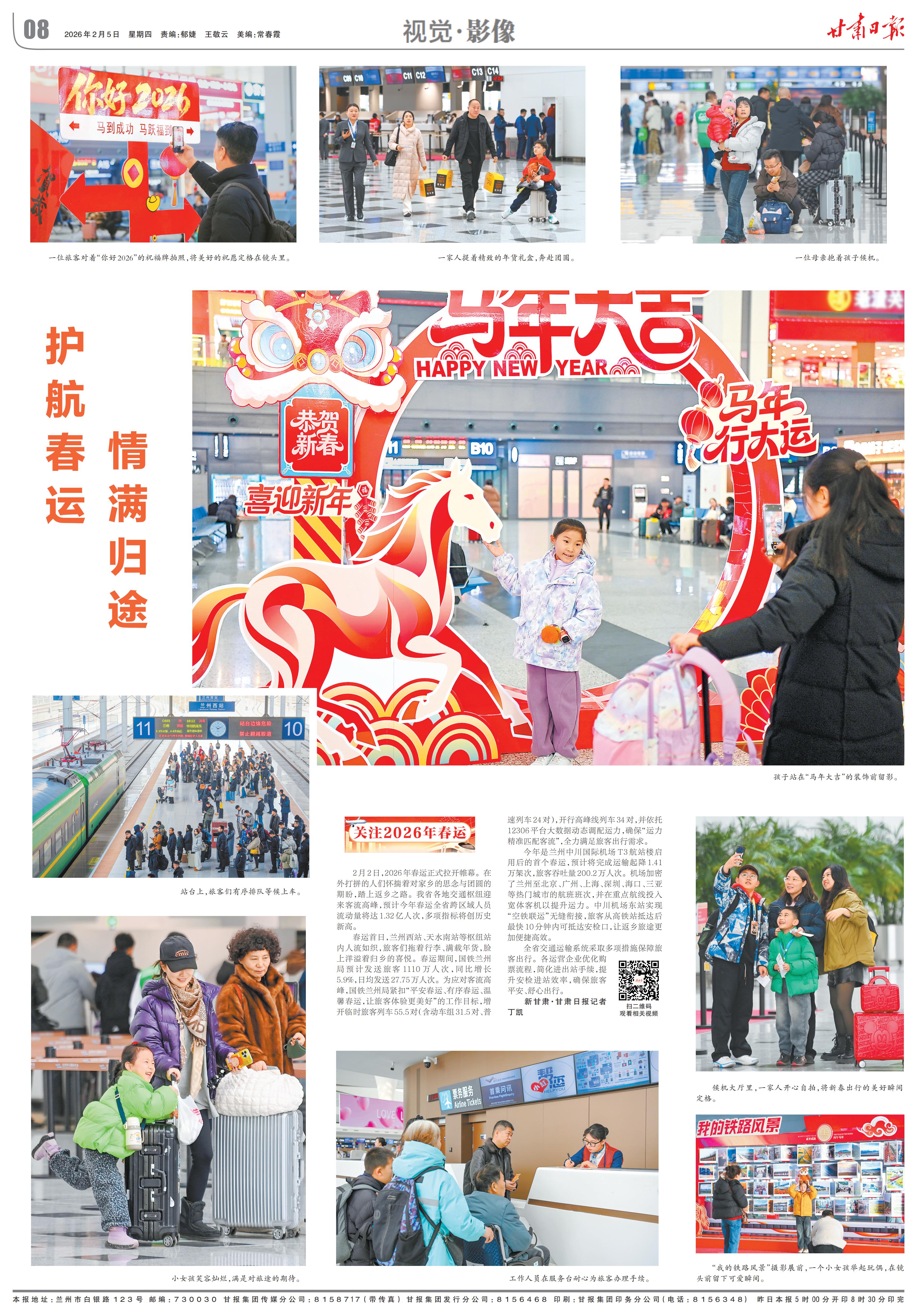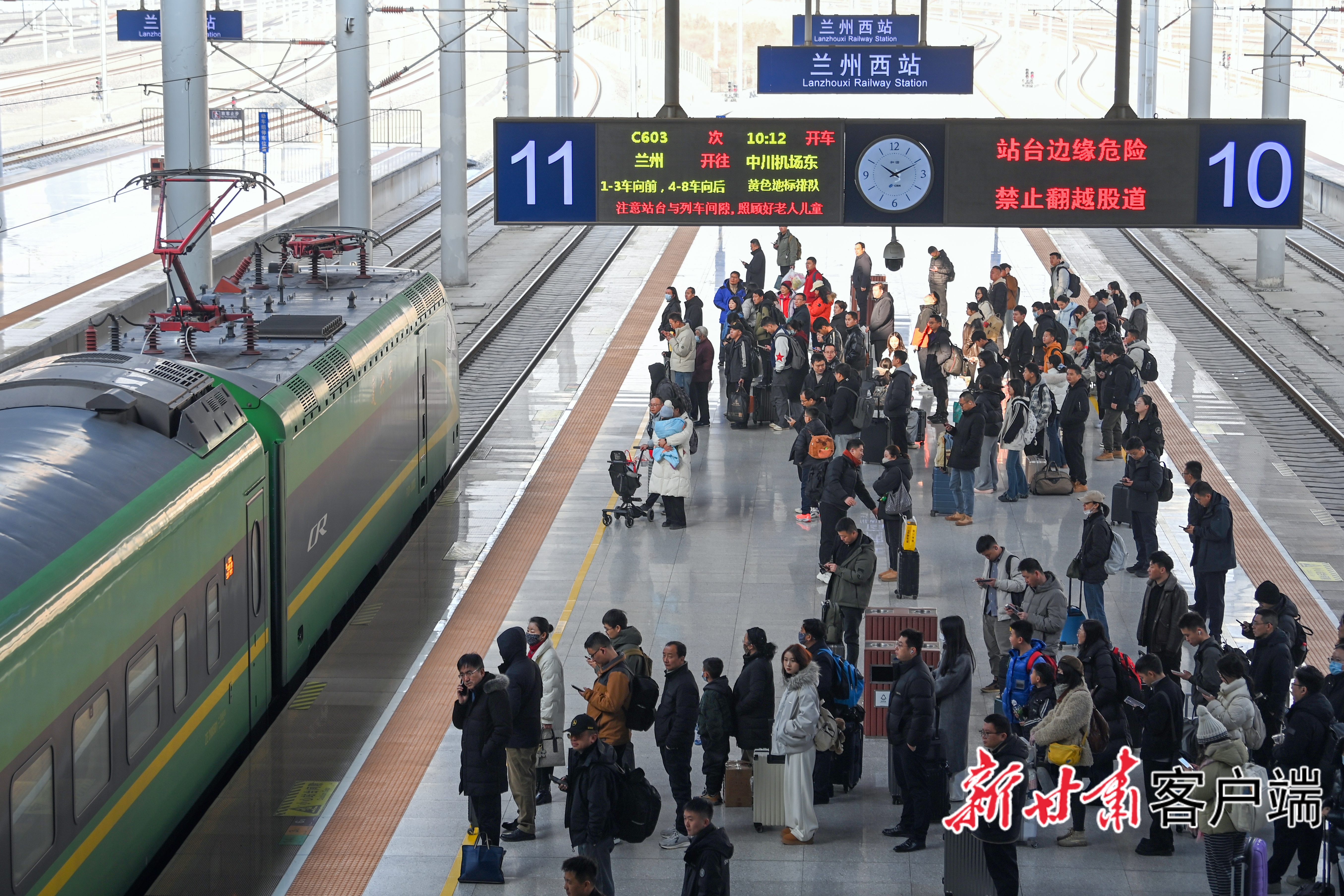 春运首日,兰州西站、天水南站等枢纽站内人流如织,旅客们拖着行李、满载年货,脸上洋溢着归乡的喜悦。春运期间,国铁兰州局预计发送旅客1110万人次,同比增长5.9%,日均发送27.75万人次。为应对客流高峰,国铁兰州局紧扣“平安春运、有序春运、温馨春运,让旅客体验更美好”的工作目标,增开临时旅客列车55.5对(含动车组31.5对、普速列车24对),开行高峰线列车34对,并依托12306平台大数据动态调配运力,确保“运力精准匹配客流”,全力满足旅客出行需求。