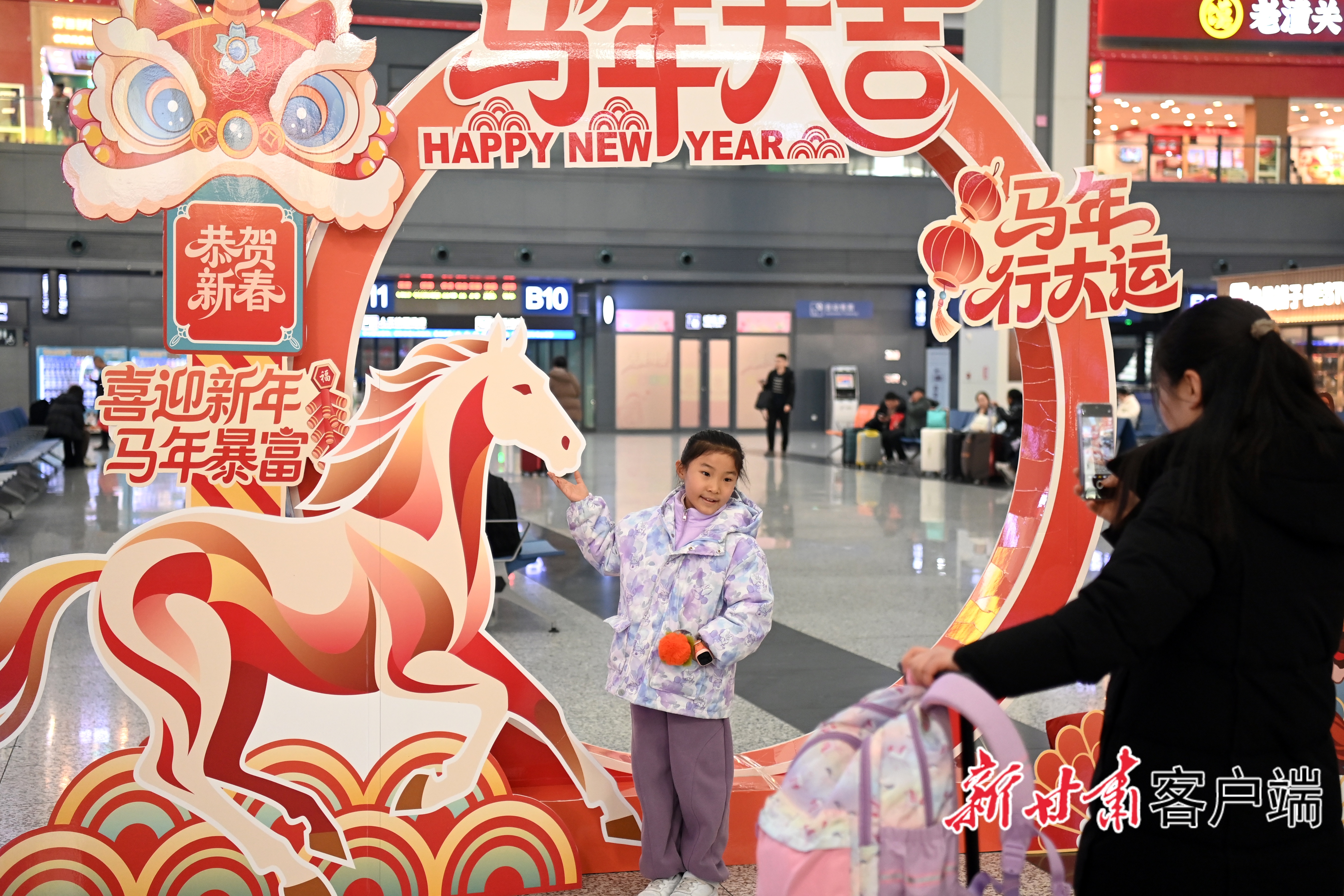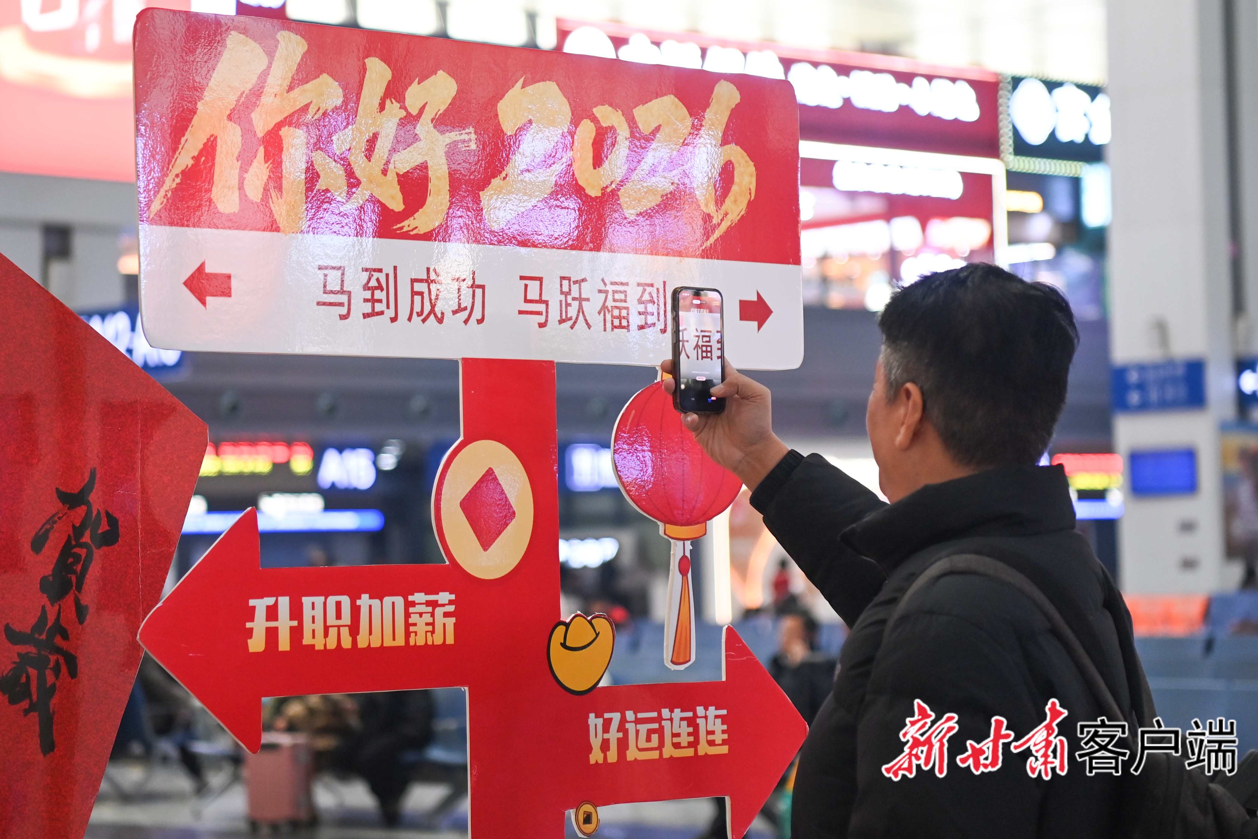 一位旅客对着“你好2026”的祝福牌拍照,将美好的祝愿定格在镜头里。