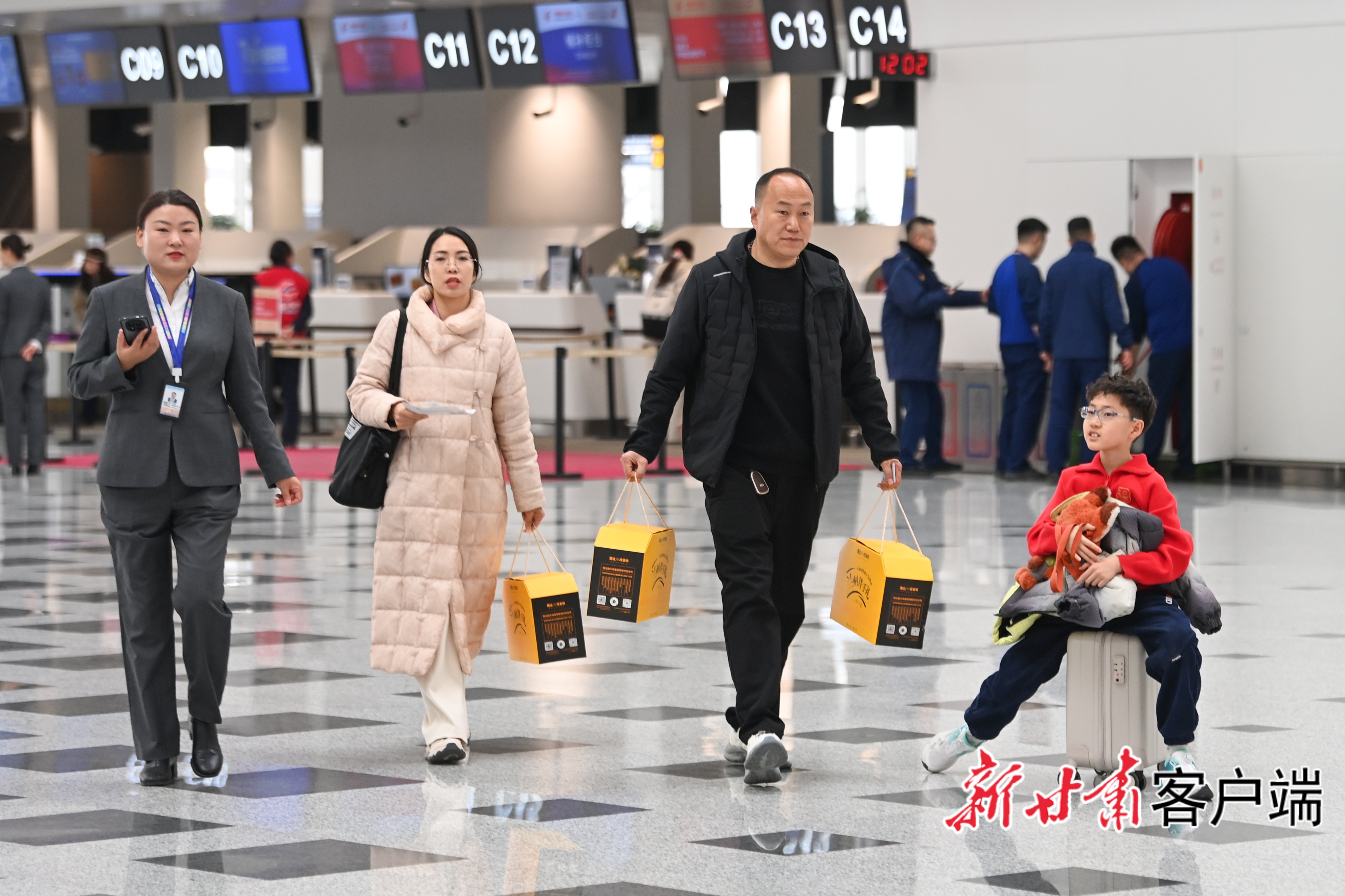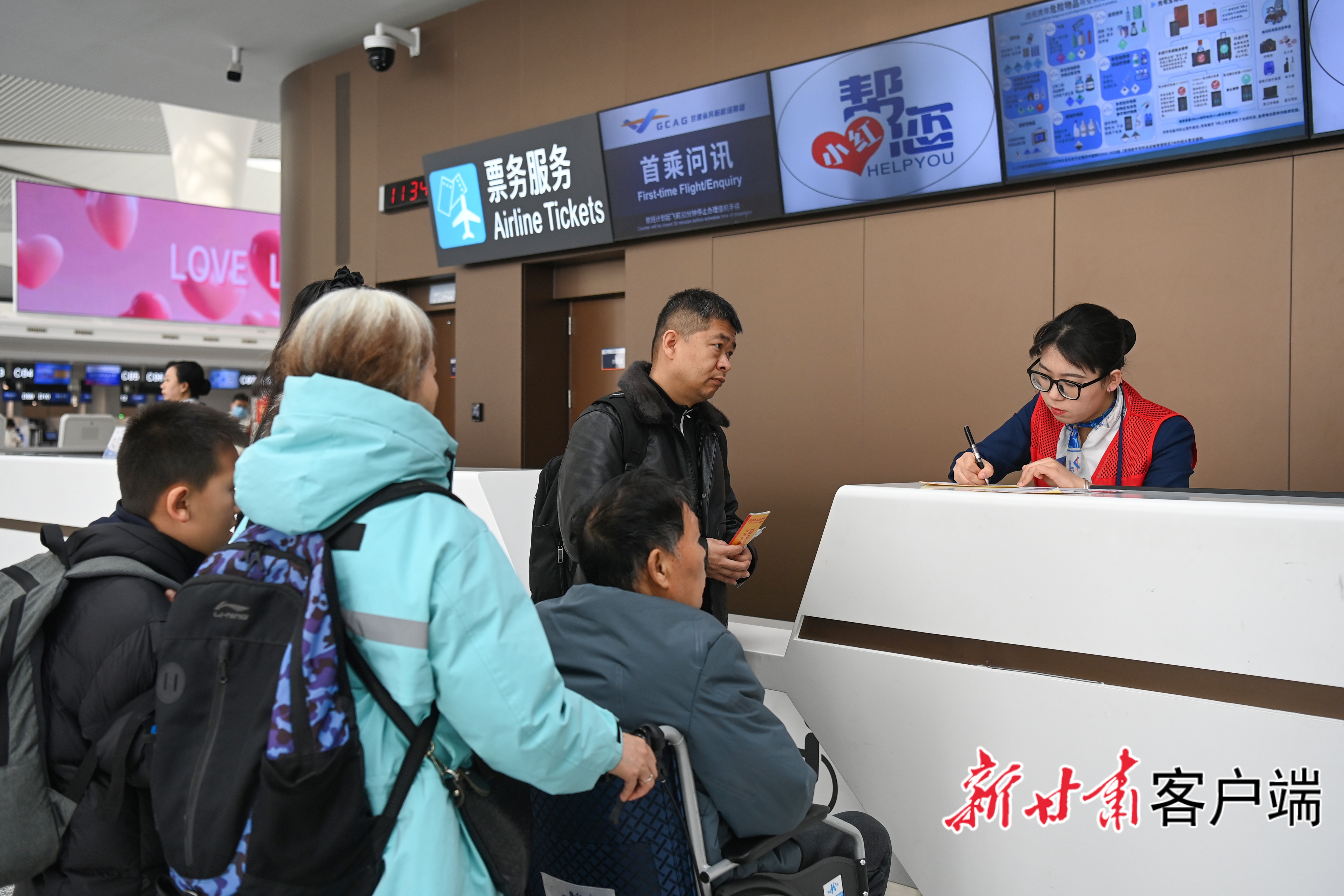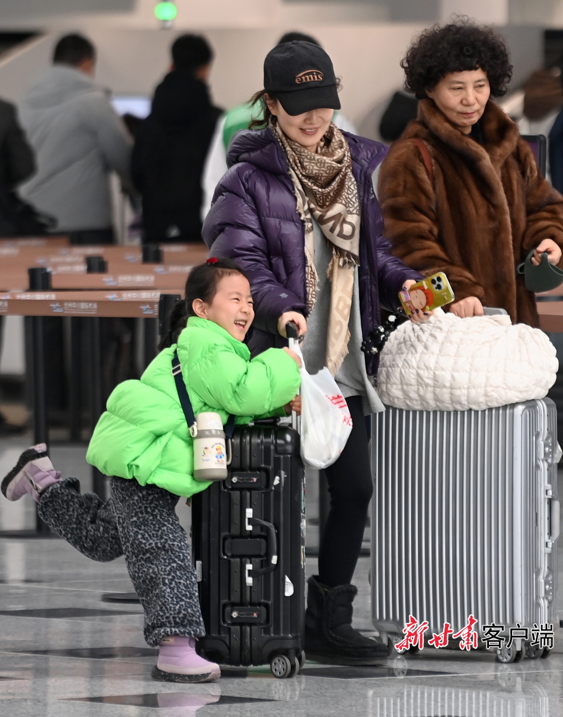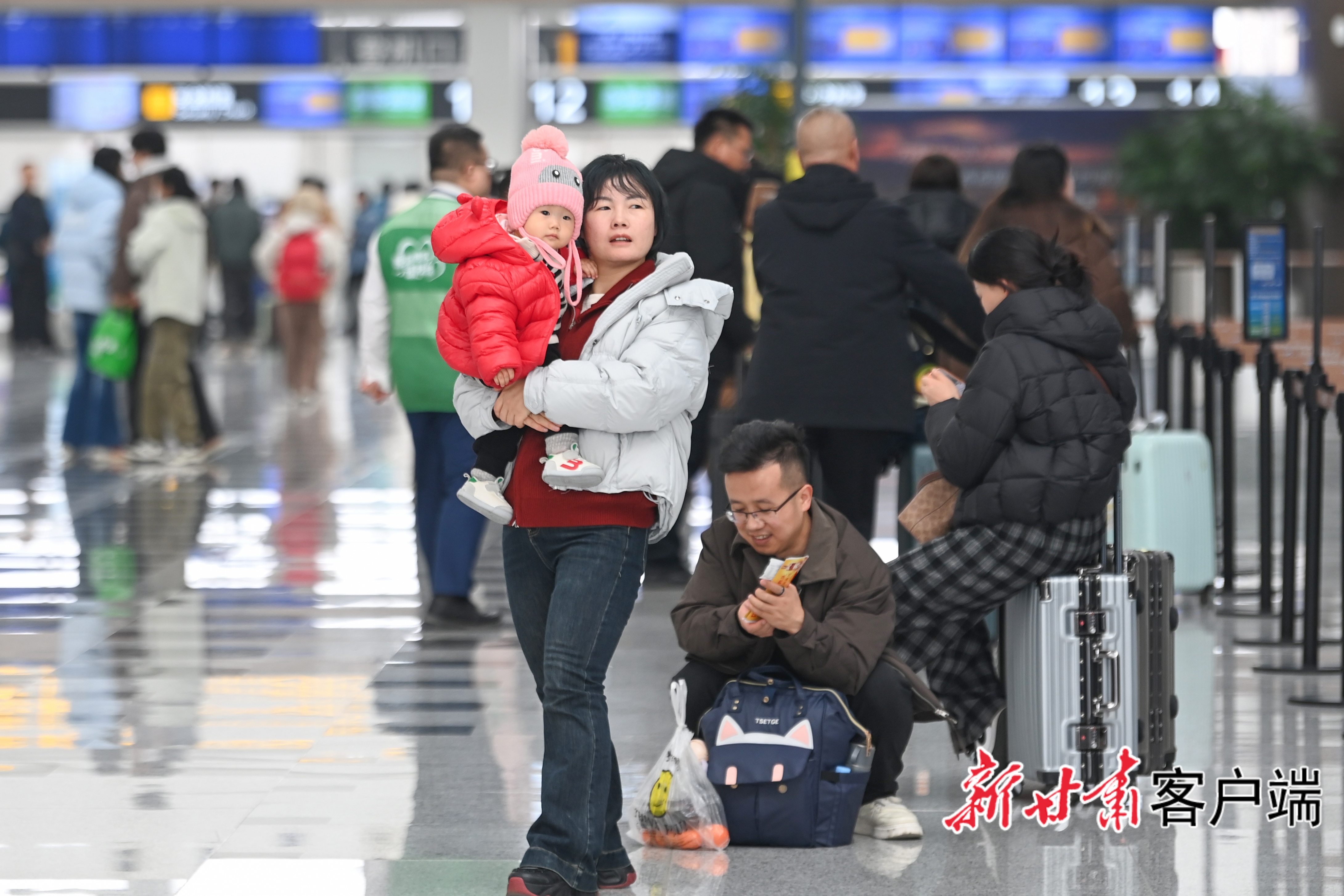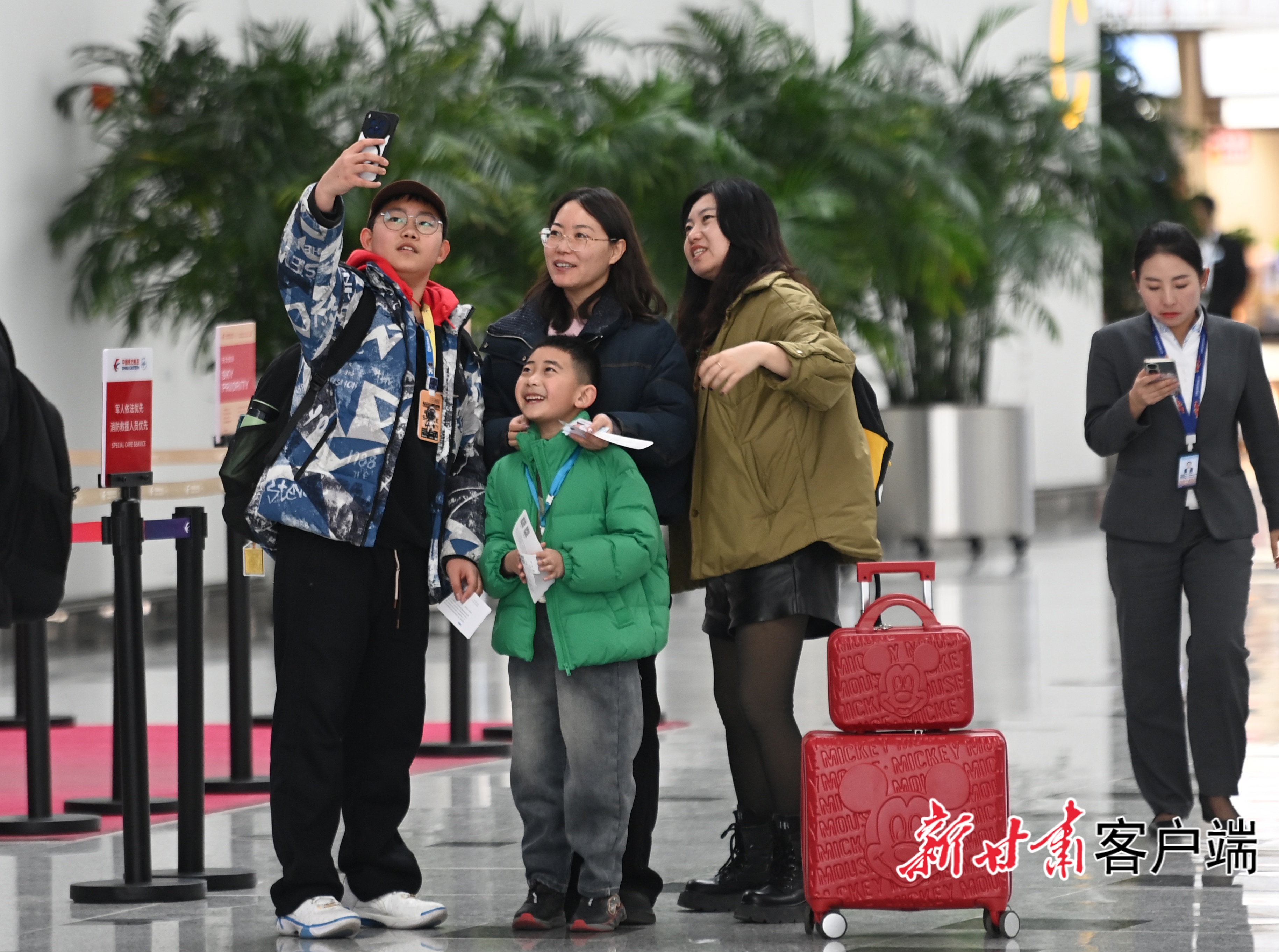 候机大厅里,一家人开心自拍,将新春出行的美好瞬间定格。