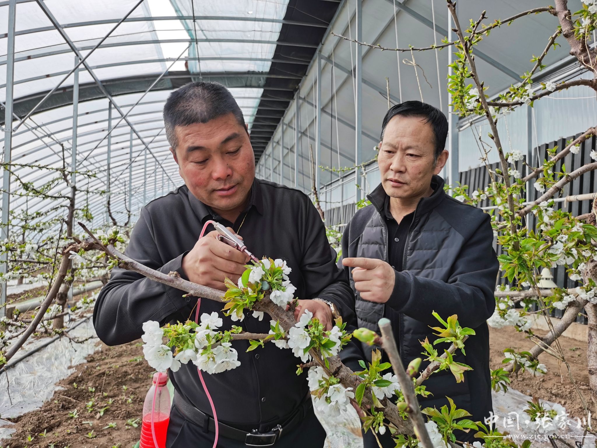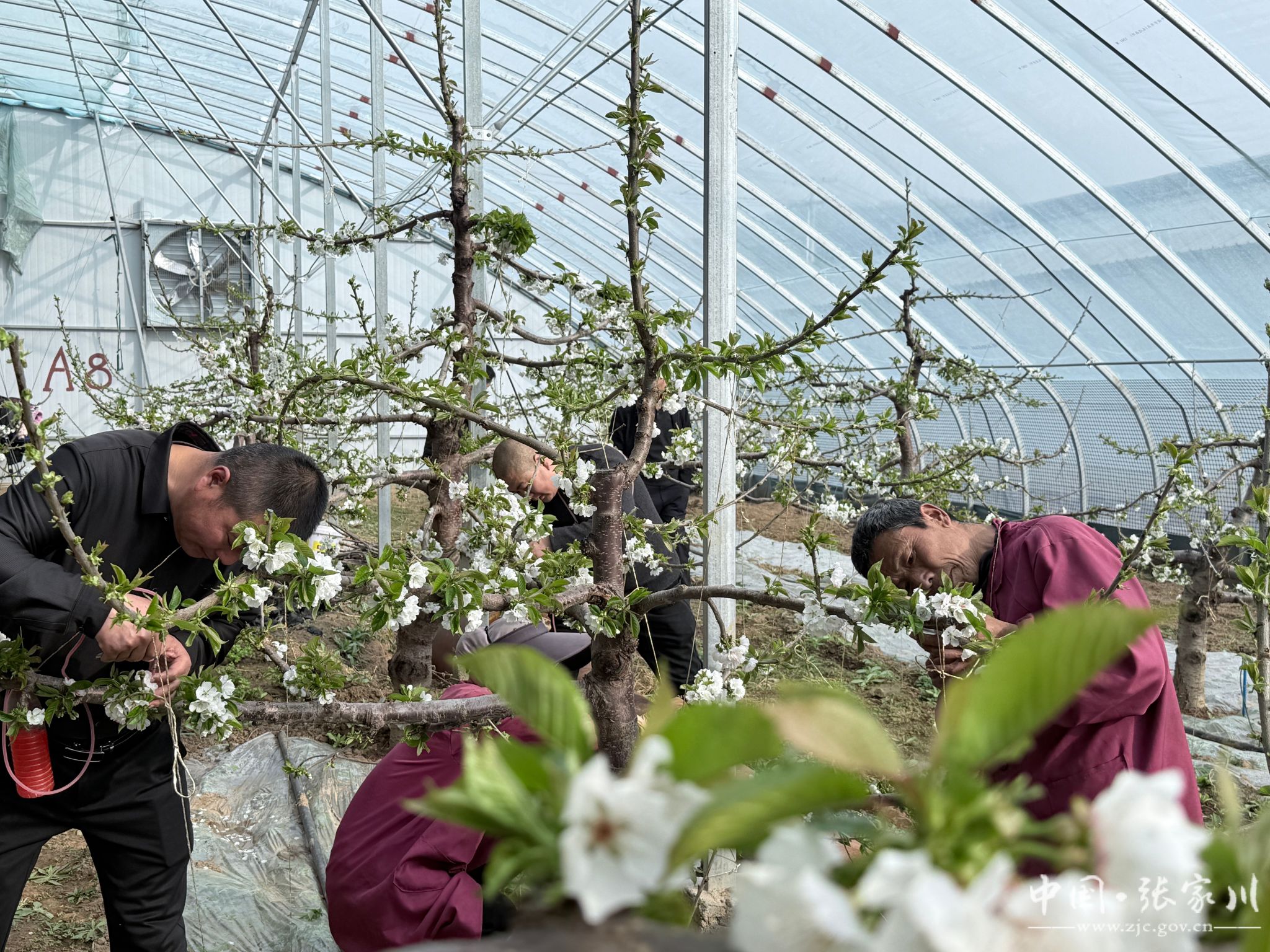 推开温室大棚的门,一股湿润的暖流裹挟着清甜的花香扑面而来。在20多度的环境里,樱桃花正值盛花期,层层叠叠的花枝间,50余名工人正俯身忙碌,有条不紊地进行人工授粉作业,忙碌的身影与绚烂花海构成了一幅生动的“春耕图”。产业园负责人县世亮穿梭其间指导作业,他抬手拂过一簇繁花介绍:“我们的大棚里面现在已经进入盛花期了,每天有50-60个工人正在进行授粉工作,把授粉工作扎扎实实做好,为今年的丰收打好扎实的基础。”