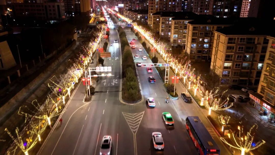 夜幕降临,璀璨的灯光照亮了安定城。在行道树枝丫间,一串串彩色灯珠、福字灯错落悬挂,“国泰民安”“繁荣昌盛”的灯牌星点排布,将对家国的美好祈愿融入璀璨灯光。同时,整条灯带沿树铺设,更加丰富了城区亮化的呈现层次。