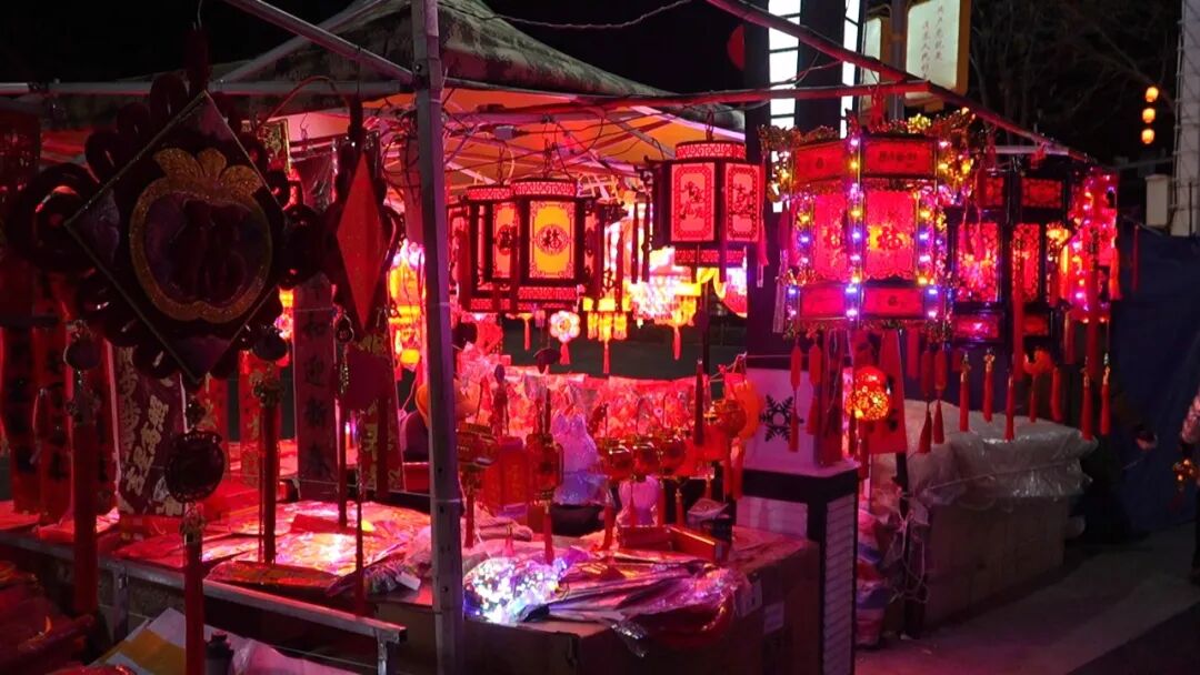在正立广场前,各式中国结灯笼沿街铺展,商贩们沿街摆开的春节福字花灯、对联照亮了整座广场,为即将到来的春节增添红火喜庆、温馨祥和的热闹氛围。