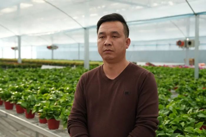 吴孝伯一边浇水一边说,以前农闲时要么闲着,要么外出打零工,辛苦又不顾家。自从村里建起花卉基地,他第一个报名,从起初认不全花苗,到现在熟练完成修剪、浇水、病虫害防治等流程,每月还能领到稳定工资,觉得日子越来越有奔头。大棚另一端,技术负责人吴正军正通过温湿度监测设备查看花卉长势。作为基地的技术骨干,他每天悉心照料这些“娇气”的花卉,同时为村民开展种植养护培训,从移栽间距到肥料配比,每个环节都手把手教学,帮助大家从“门外汉”成长为“懂行人”。