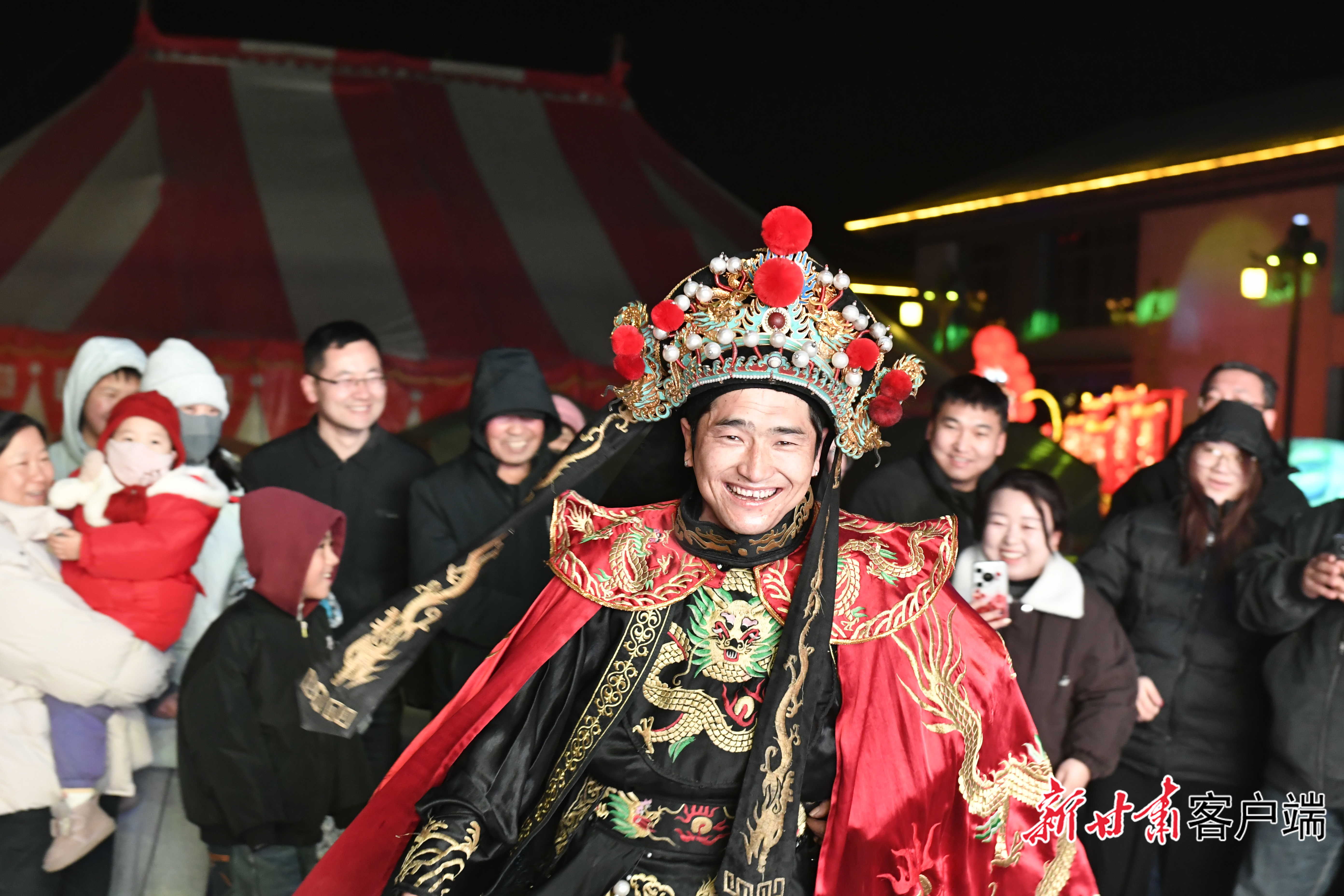 音乐响起,灯会民俗表演开场。凉州小伙儿高兴成先表演川剧变脸,引得台下喝彩声不断,之后又一袭红衣,深吸一口气,俯身向前,口中瞬间喷出熊熊火焰,火舌在夜色中划出耀眼的弧线,引得观众阵阵欢呼……