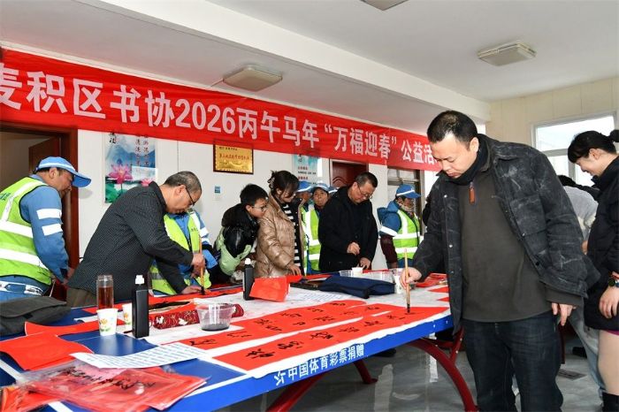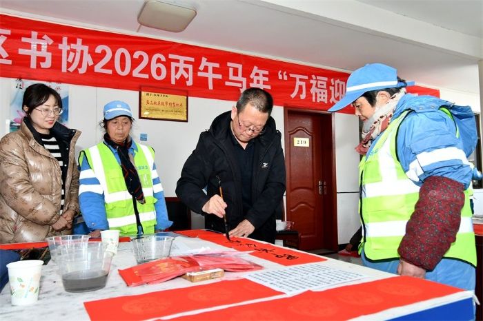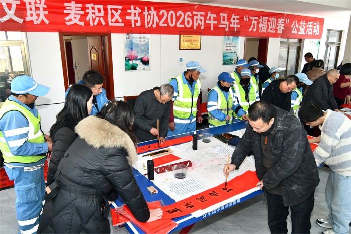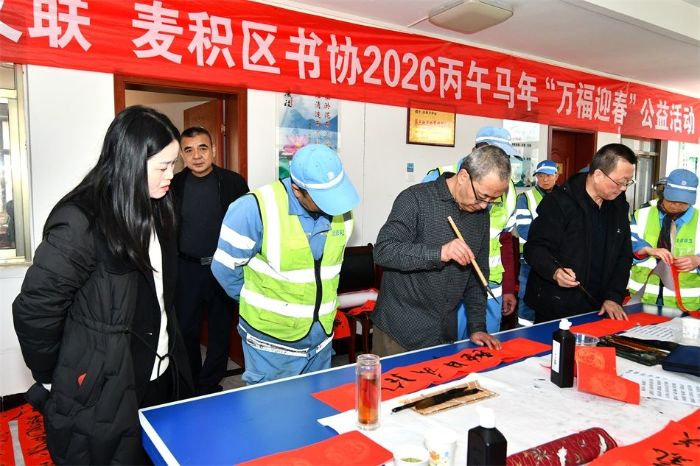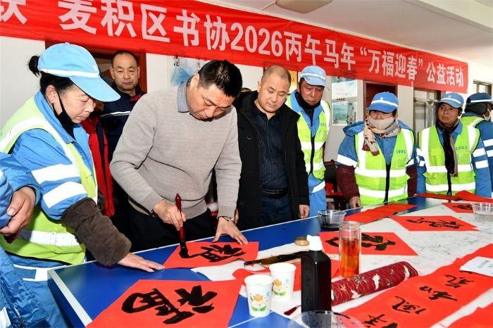 麦积区融媒体中心讯(记者 窦耀辉 实习记者 窦艺)墨香传暖意,万福贺新春。为弘扬中华优秀传统文化,致敬一线环卫工作者,2月9日,麦积区文联2026丙午马年“万福迎春”公益文艺惠民活动走进区环卫中心,以传统文化艺术形式送上真挚的新春问候,表达对环卫工作者的崇高敬意。