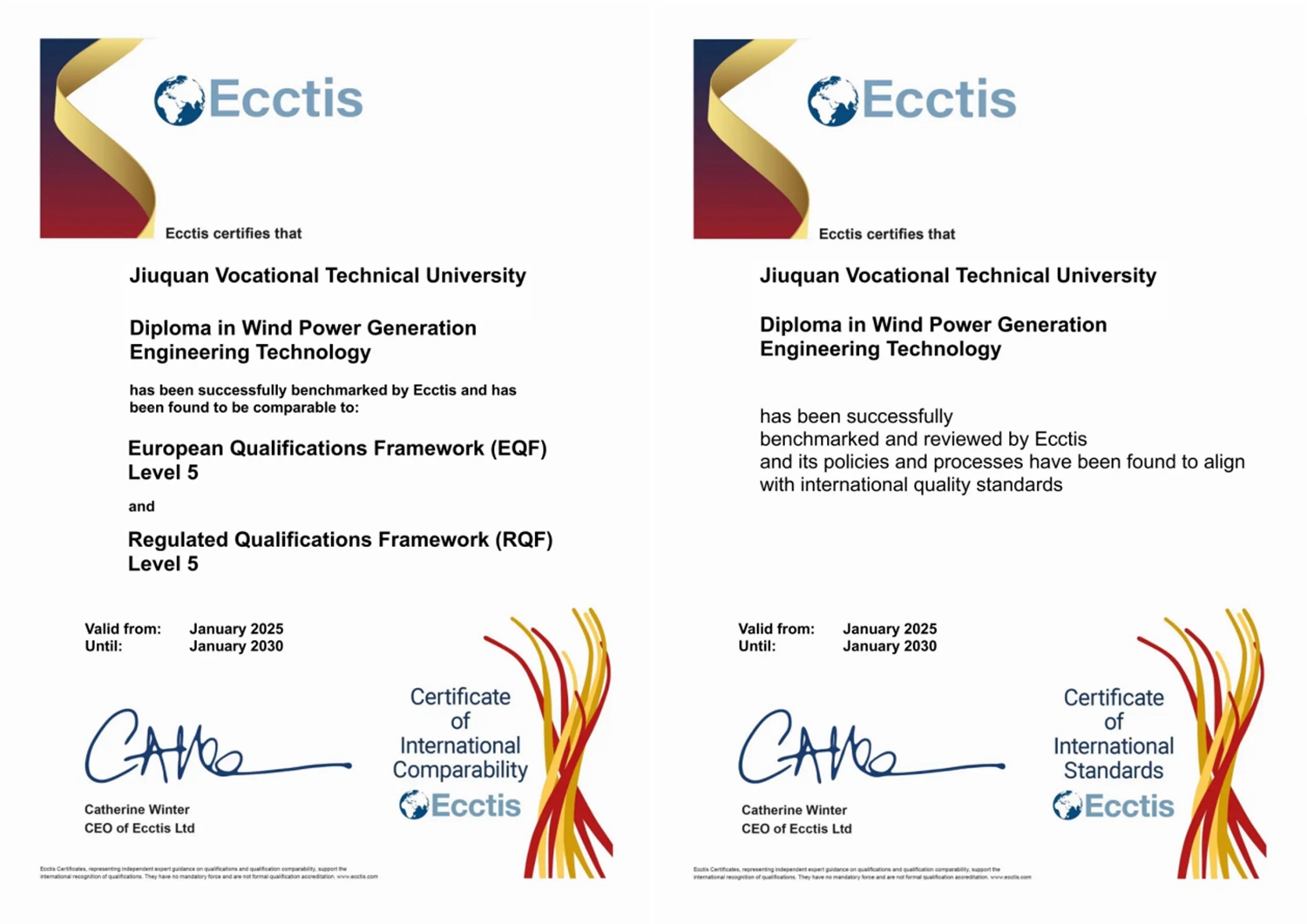 作为国家首轮及第二轮“双高计划”建设项目重点建设专业群核心专业,酒泉职业技术大学风力发电工程技术专业自2023年10月启动UK ENIC国际认证工作。认证过程中,UK ENIC专家通过线上复审、深度质询等多环节严格评估,高度认可学校专业结构设置、多样化教学模式及健全的质量保障体系,最终于2025年4月顺利通过认证。
