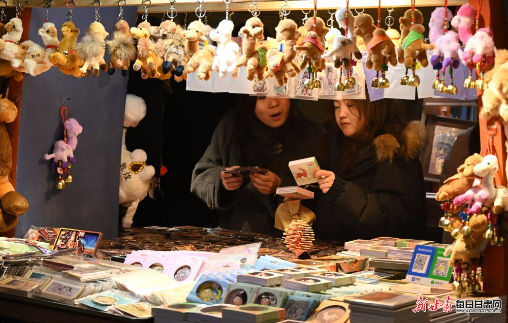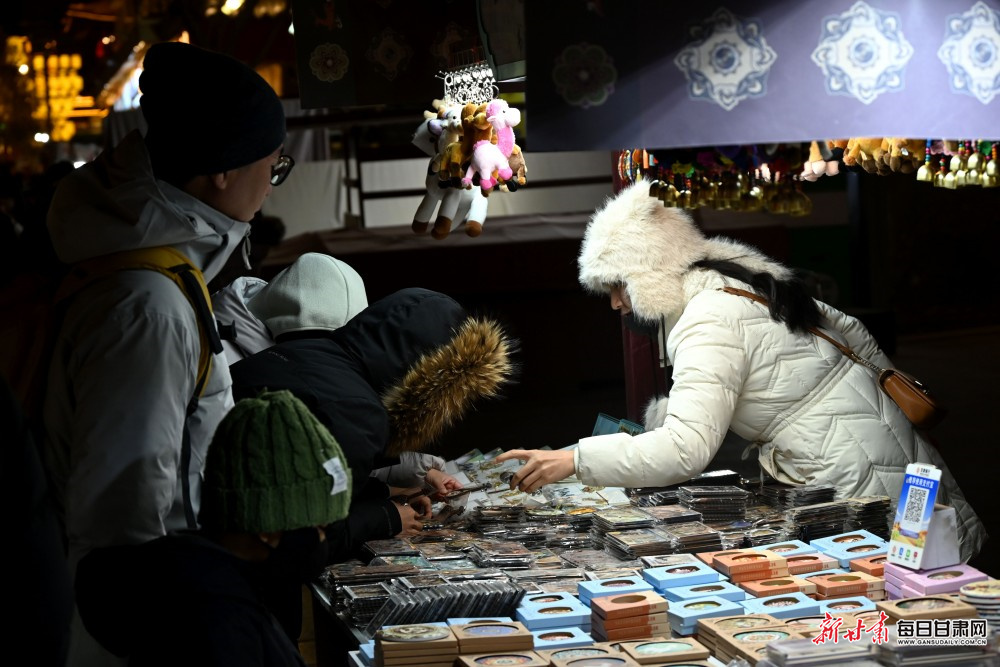 本届“千年华彩·盛世敦煌”灯会在夜市免费开放,飞天、九色鹿、三兔共耳等敦煌壁画元素的大型灯组与千余盏花灯交相辉映,现代光影技术让千年文化“活”了起来。夜幕降临,市民与游客穿梭其间,赏灯拍照、猜灯谜、看非遗展演;摊位上,驴肉黄面、红柳烤肉、李广杏皮茶香气四溢,文创手作琳琅满目,欢声笑语此起彼伏。