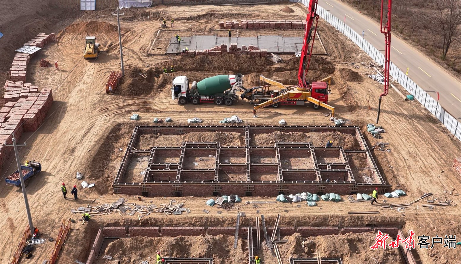 130多名工人分布在各个工作点位上,正在分阶段进行定位放线、土方开挖、钢筋绑扎、墙体砌筑等基础施工,各个环节紧密衔接,现场热火朝天。