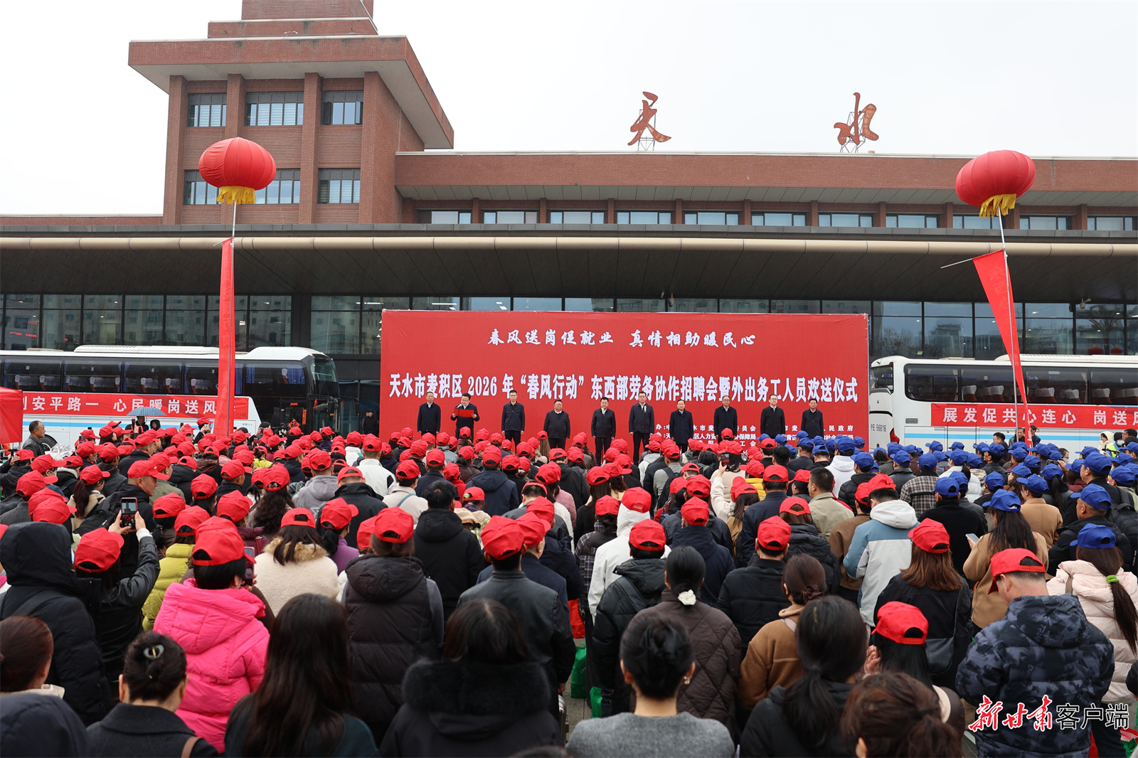 新甘肃客户端天水讯(新甘肃·甘肃日报记者 安东)近日,由麦积区人社局主办、区劳务办承办,麦积区总工会、天津市西青区人社局协办的2026年“春风行动”东西部劳务协作招聘会暨外出务工人员欢送仪式举行,600余名务工人员将通过“点对点”专车、专列奔赴江浙等地就业。