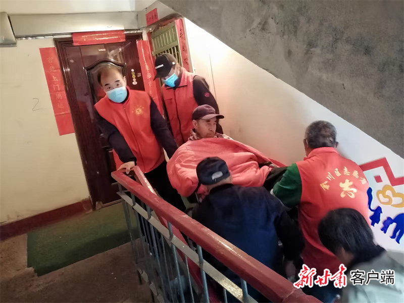 金川区北京路街道金冶里社区党委书记和社区志愿者合力在楼梯间护送瘫痪老人,传递社区温情关怀。