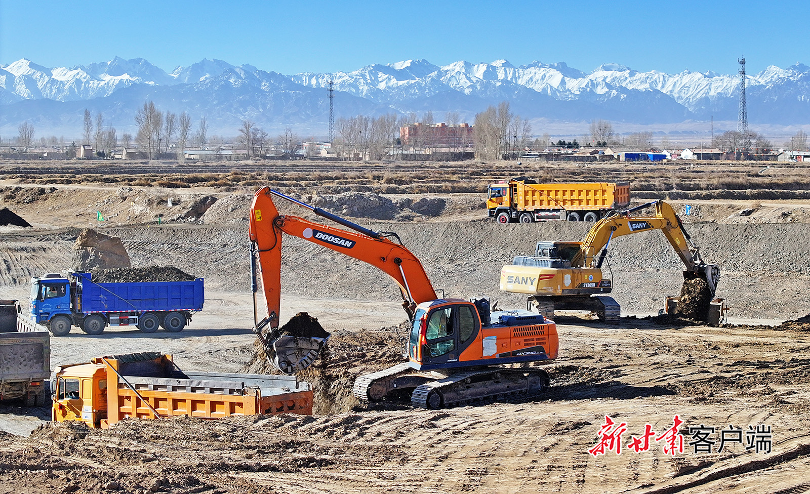 3月10日,在民乐县六坝镇五坝村高标准农田节水项目建设现场,运输车辆往来穿梭,各种大型机械设备轰鸣声此起彼伏,现场一派热火朝天的建设景象。新甘肃·甘肃日报通讯员 王晓泾 杨玉红