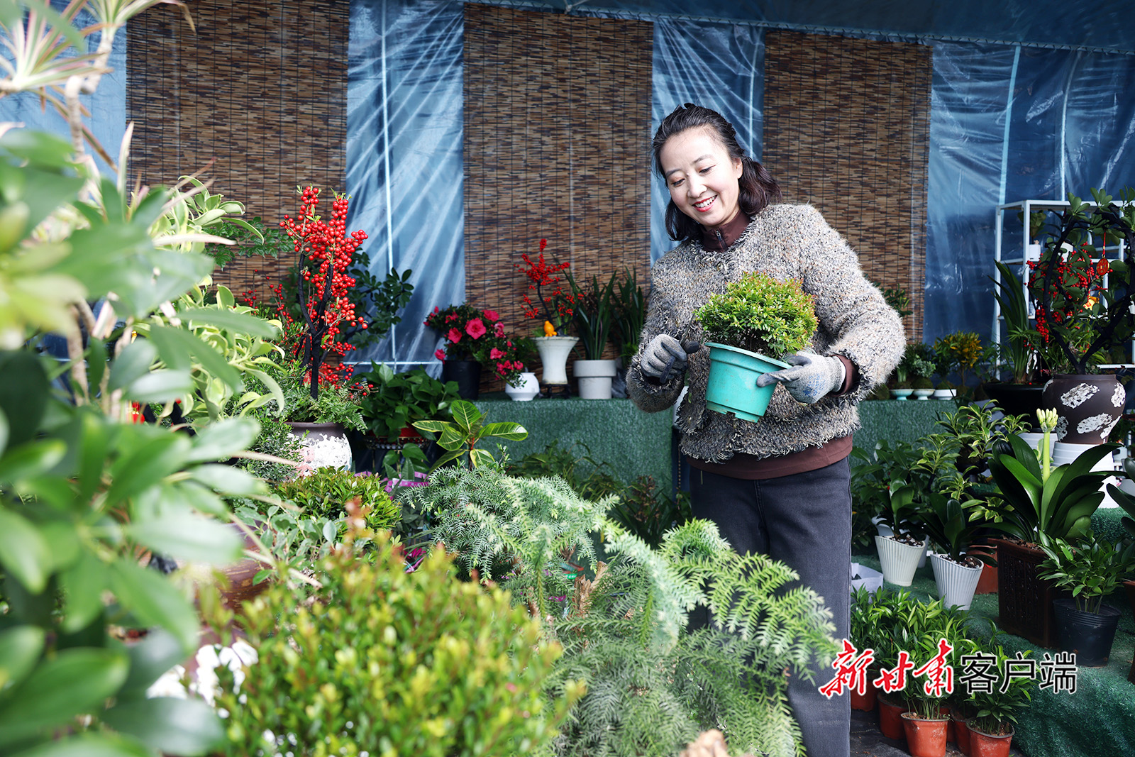早春时节,庆阳市西峰区后官寨镇王岭村花卉苗木基地温室大棚内暖意融融、繁花似锦,花农们穿梭花海为顾客挑选盆景。新甘肃·甘肃日报通讯员 盘小美