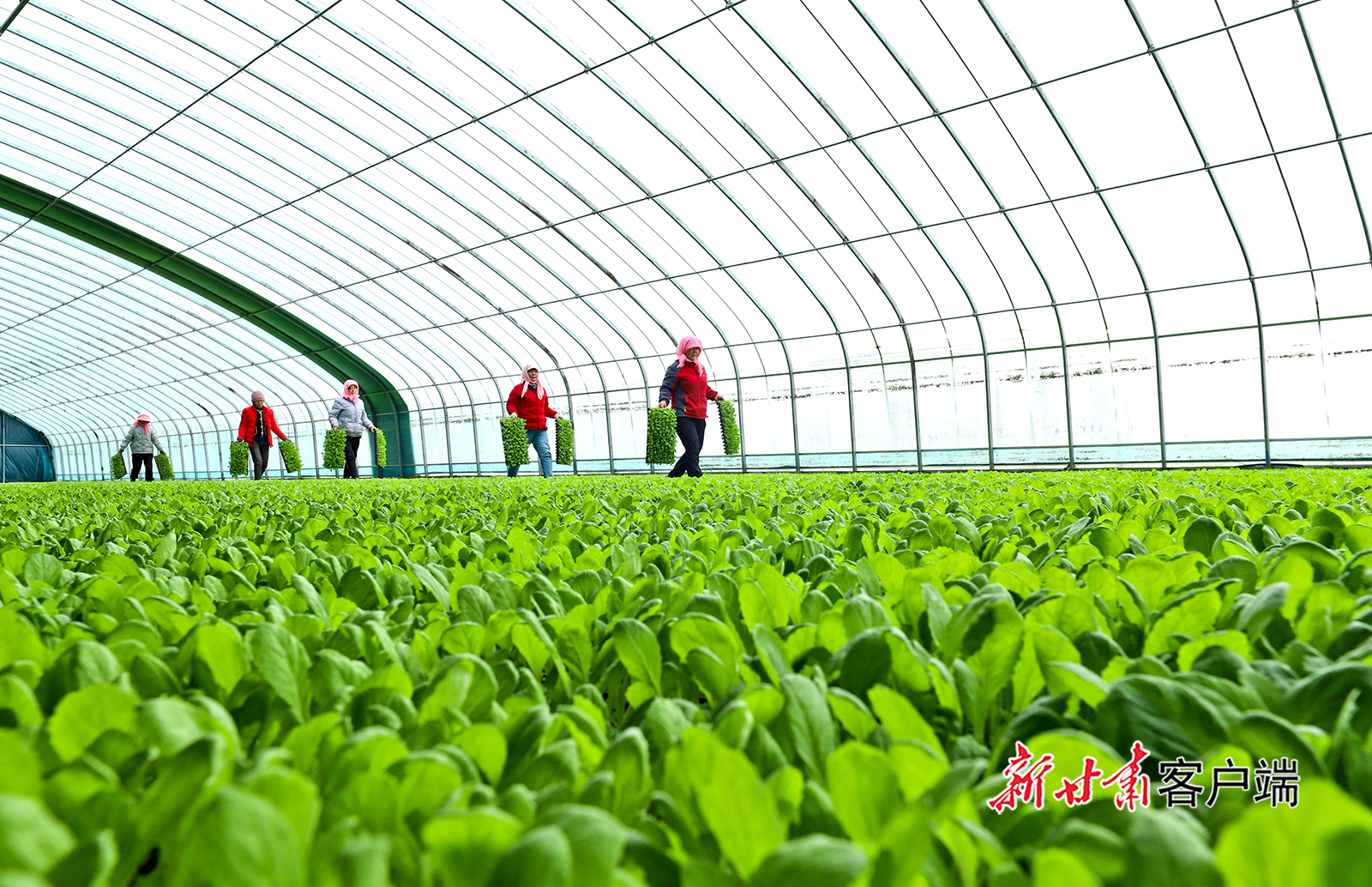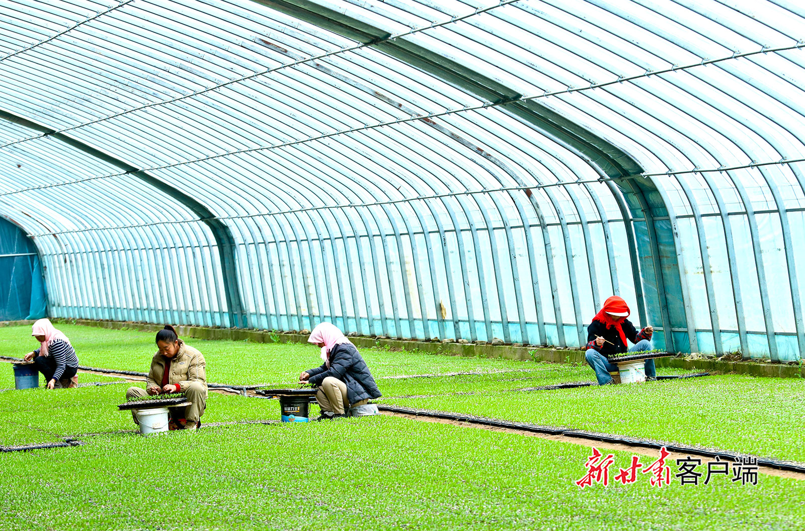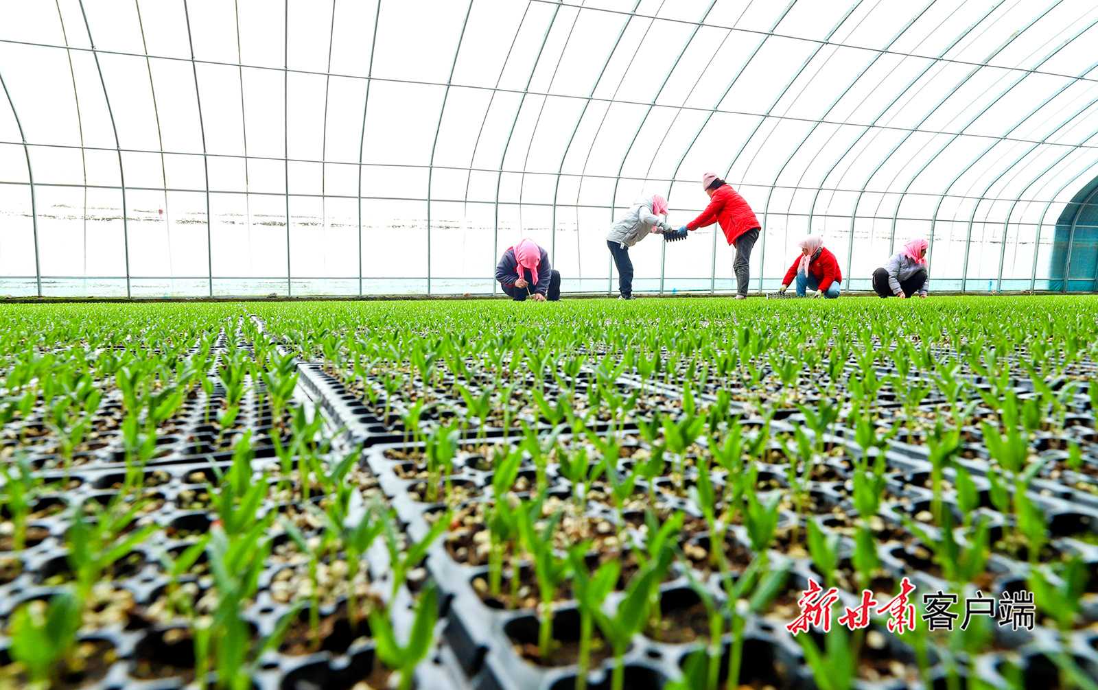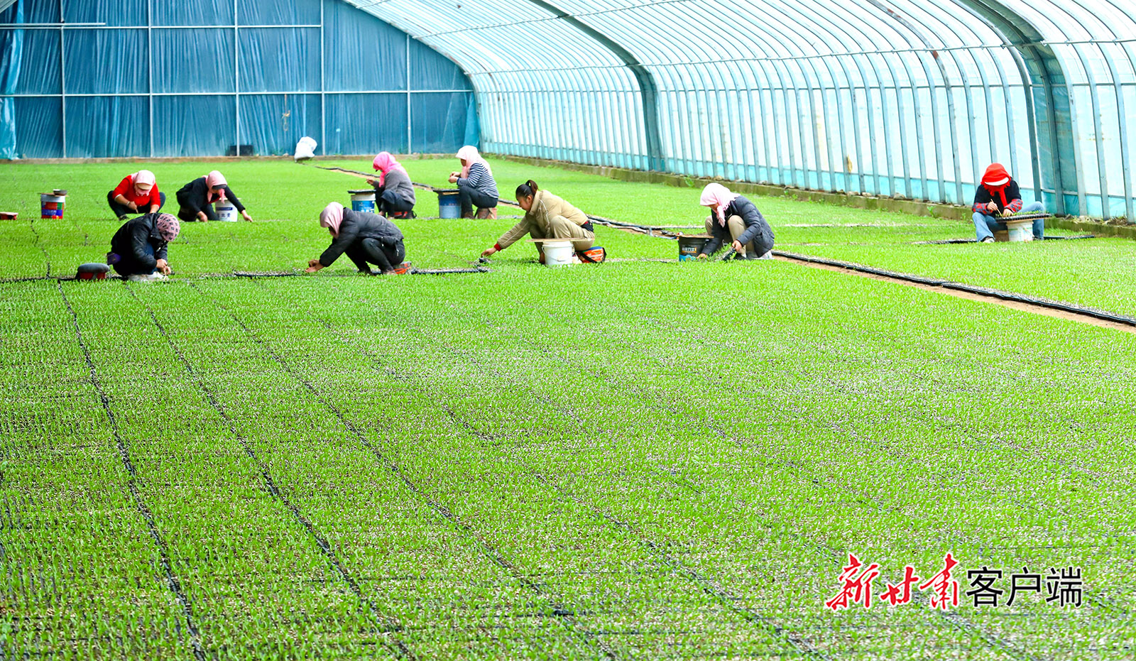 3月12日,高台县巷道镇太安村现代农业全产业链示范基地育苗中心内,育苗人员正在开展蔬菜育苗转运、管护工作。