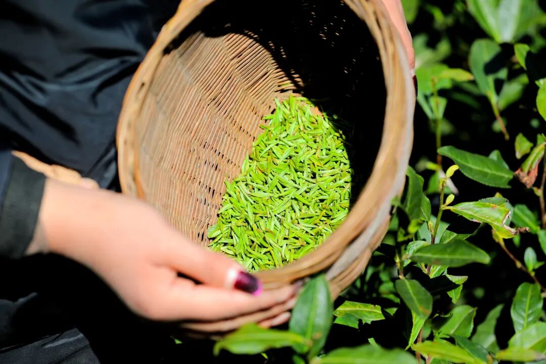 “一芽,长度控制在1.5厘米以内,一芽一叶,长度控制在2厘米左右,必须一颗一颗精挑细采。”茶农杨爱玲手把手指导身旁的工人,竹篓里的鲜芽透着嫩绿生机,满是春日灵气。她直起身,指着门前连片的茶园说:“这一斤龙井43#干茶,得采56000多个芽头。”