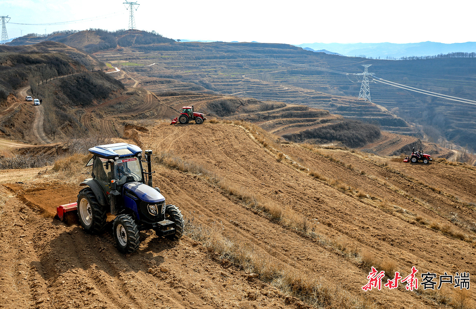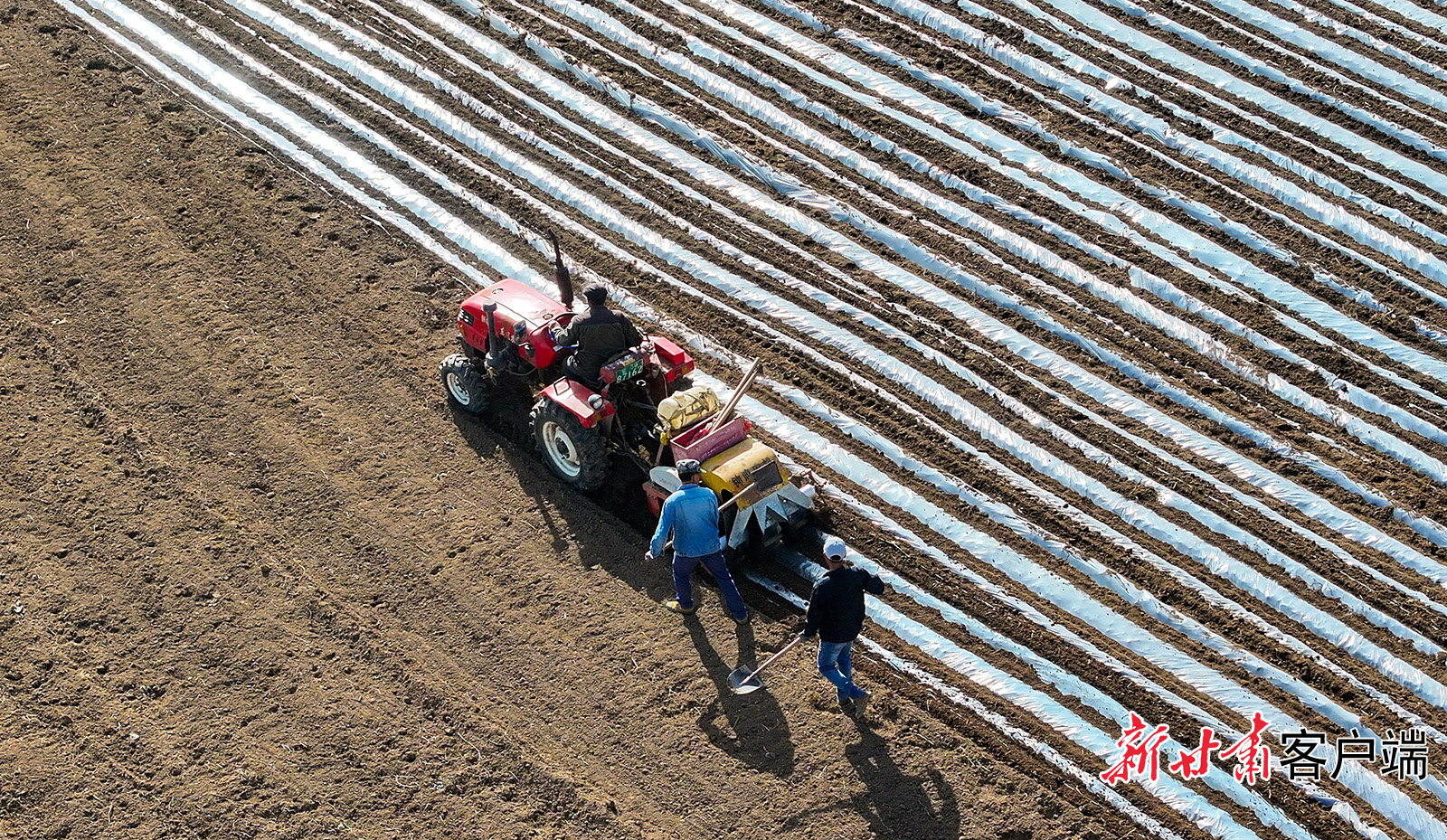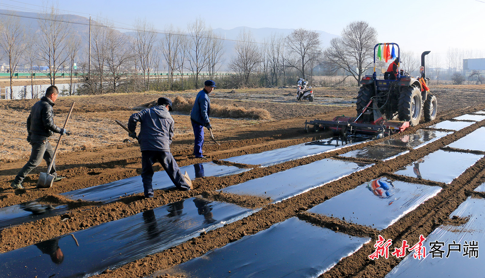 3月5日,在通渭县什川镇吴湾村,随处可见农户整地施肥、机械覆膜的忙碌身影。新甘肃·甘肃日报通讯员 陈佰万