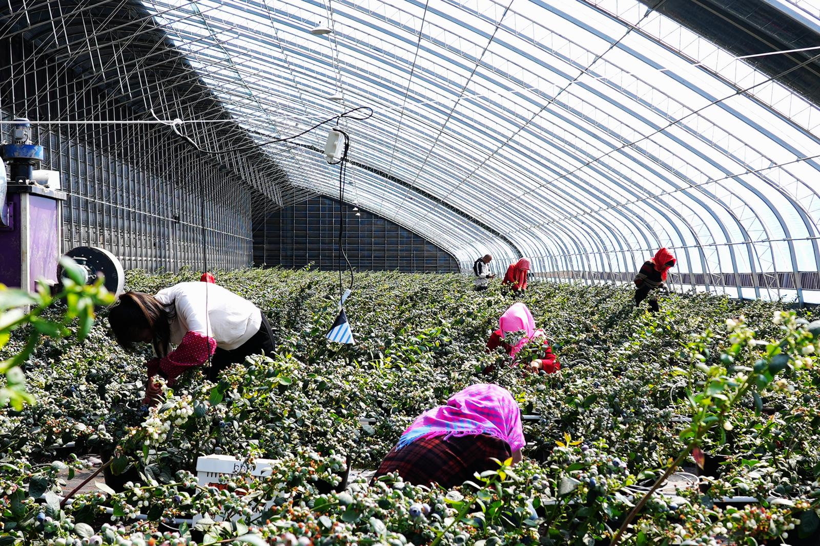 3月25日,走进黑方台蓝莓种植基地,智能化的滴灌系统精准地为每一株蓝莓树输送水分,温室大棚内的温度、湿度、光照实现智能化监控调节。工人们小心翼翼地采摘蓝莓,她们拿着剪刀,沿着成熟果实根部轻轻剪下,装进篮中,保证每一颗蓝莓新鲜带霜,口感优良。