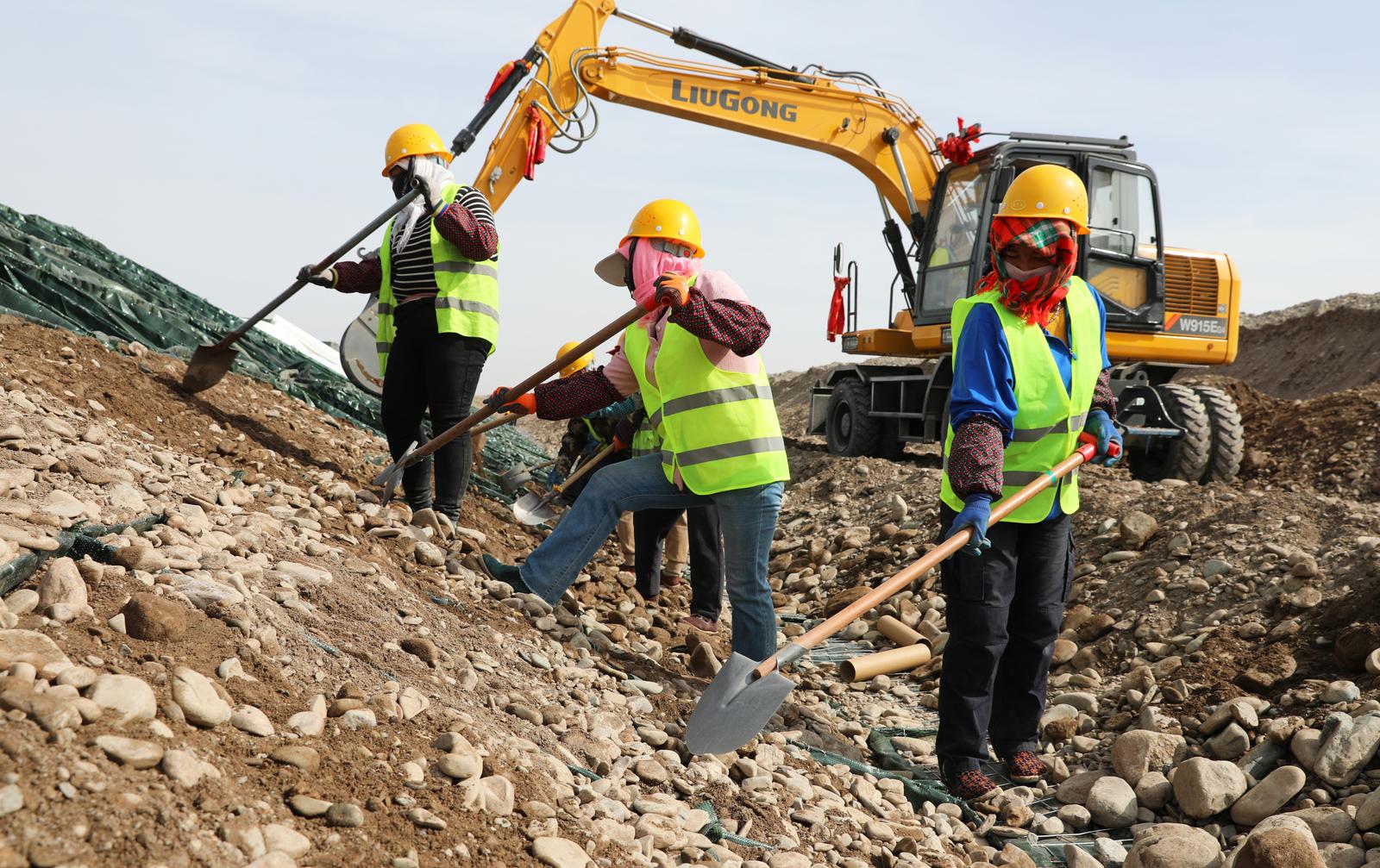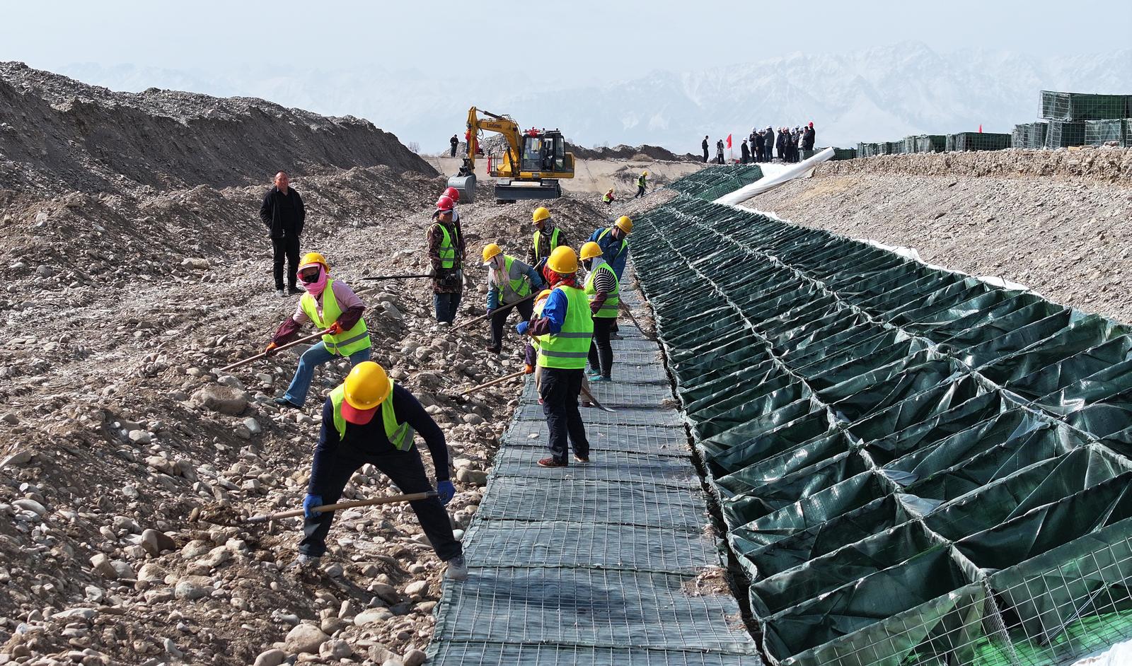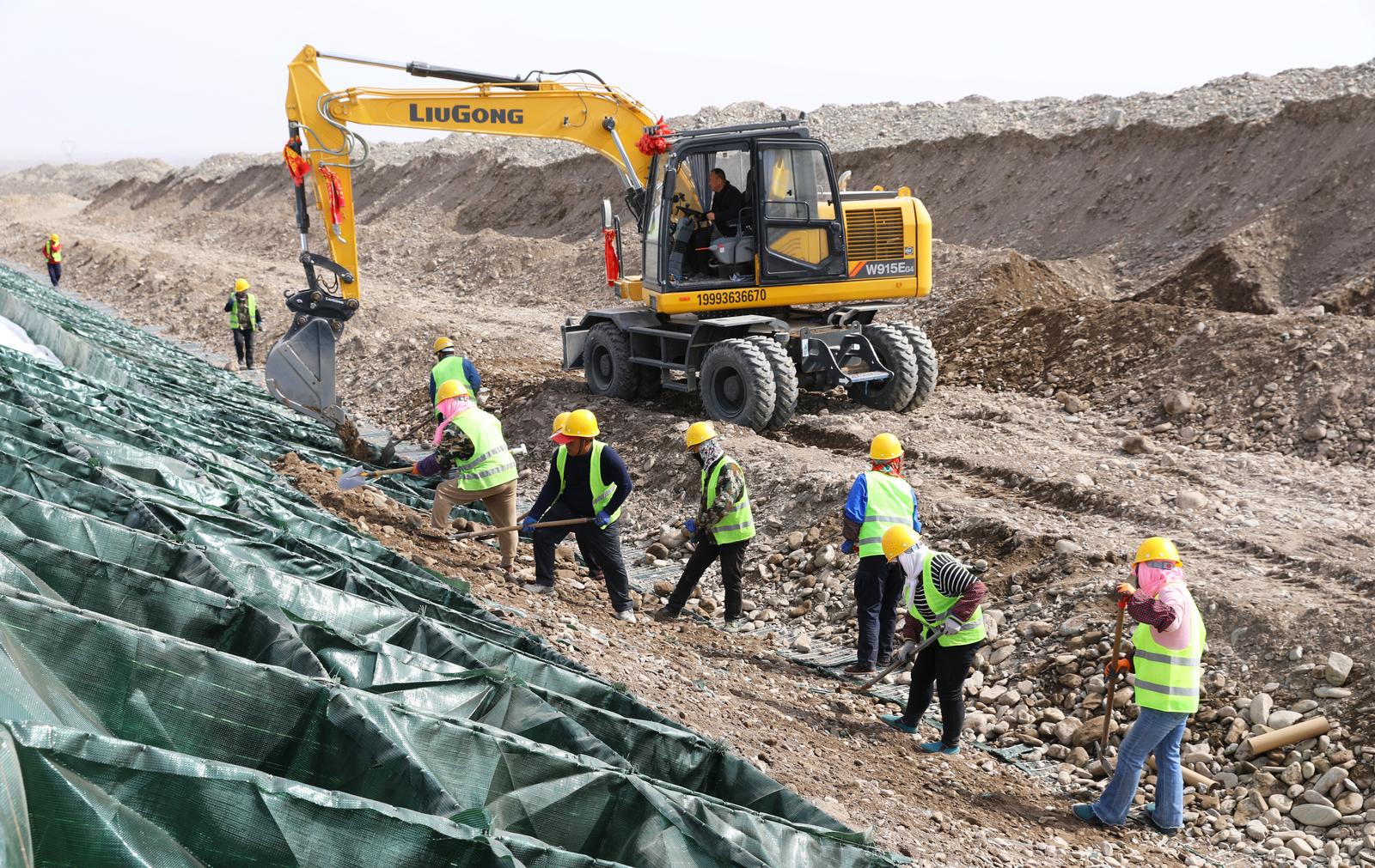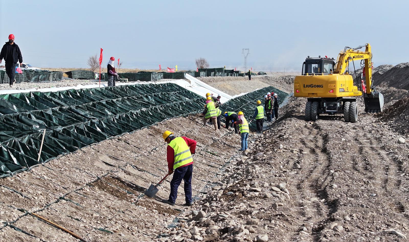 近日,在张掖市民乐县大堵麻河防洪治理工程项目施工现场,工人们正在紧张有序地修筑河堤。
