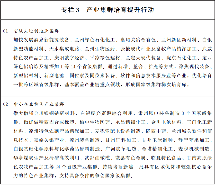 实施产业创新工程,聚焦新能源、新材料、电子信息、航空航天、生物医药和高端医疗装备、核产业等重点领域,整合科技创新资源,壮大链主企业、龙头企业、头部企业,因地制宜推动战略性新兴产业集群发展。实施新技术新产品新场景大规模应用示范行动,加强基础设施和应用场景建设,扩大产业增量,补齐产业链短板,打造发展新引擎、培育发展新支柱。加快发展有色金属、新能源电池、先进钢铁、化工等新材料,建设金昌、白银、兰州、武威等新材料基地。支持天水集成电路封测和特种芯片产业集群向高端化迈进,建设天水、兰州电工电器装备制造基地。构建生物医药“一核一圈多区”发展格局,发展现代中医药、生物制药、医疗器械、化学药及制剂产业,建设中国生物西北医美产业化基地和血液制品生产基地。聚焦打造综合性商业航天母港,构建以酒嘉地区商业火箭、兰州商业卫星配套产业为主导的“西箭东星、多极支撑”商业航天发展格局。统筹推进低空空域改革、设施建设、设备制造,有序拓展生产作业、交通物流、公共治理、低空消费等领域应用场景,因地制宜、稳妥有序推进低空经济健康发展。培育支持专精特新企业和专精特新“小巨人”企业发展。