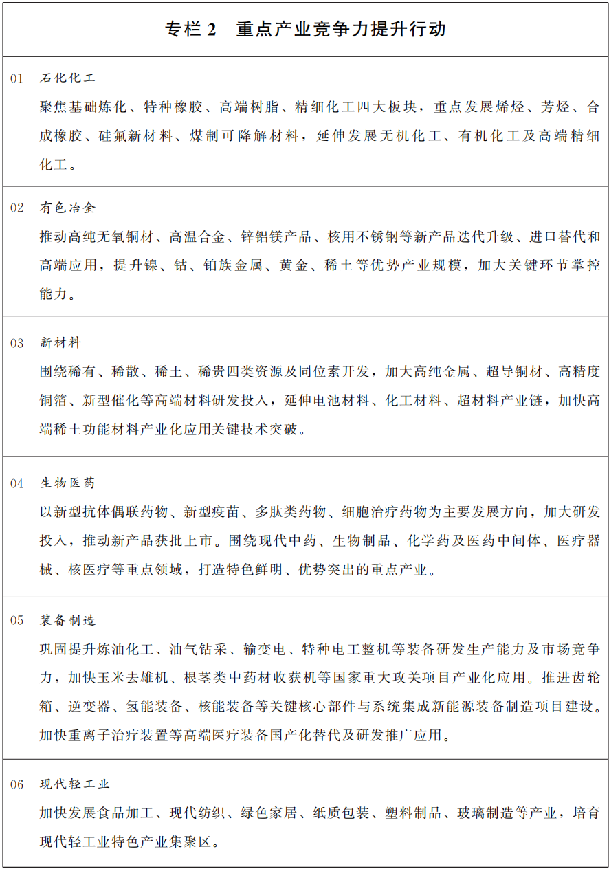 聚焦打造“甘肃制造”,坚持国家标准引领、数智绿色技术赋能、环保安全制度约束,推动重点产业提质升级、制造业技术改造升级。实施石化化工产业延链补链行动,持续推进“减油增化增特”,推动精细化工产业发展,提升合成树脂、特种橡胶、有机助剂等高端产品供给水平,积极发展煤基新型合成材料、先进碳材料、可降解材料等产业链,提升化工新材料领域竞争力。推动煤化工产业向现代化、高端化、多元化转型。实施有色冶金产业高端延伸行动,壮大镍钴、精品铜铝加工等千亿级产业链,做精高端特种钢材产业,发展稀有、稀散、稀土金属产业和黄金等贵金属产业。实施装备制造产业提档扩能行动,做强做优电工电气装备、石化通用装备、通用航空装备、高档数控机床、现代农机装备等细分行业,壮大工业母机产业集群,全力打造装备制造产业集聚区。培育壮大现代轻工业。实施制造业技术改造、大规模设备更新,加快推动工艺技术升级迭代。强化市场优胜劣汰机制,畅通落后低效产能退出渠道。加快制造业数智化转型,提升绿色制造水平。