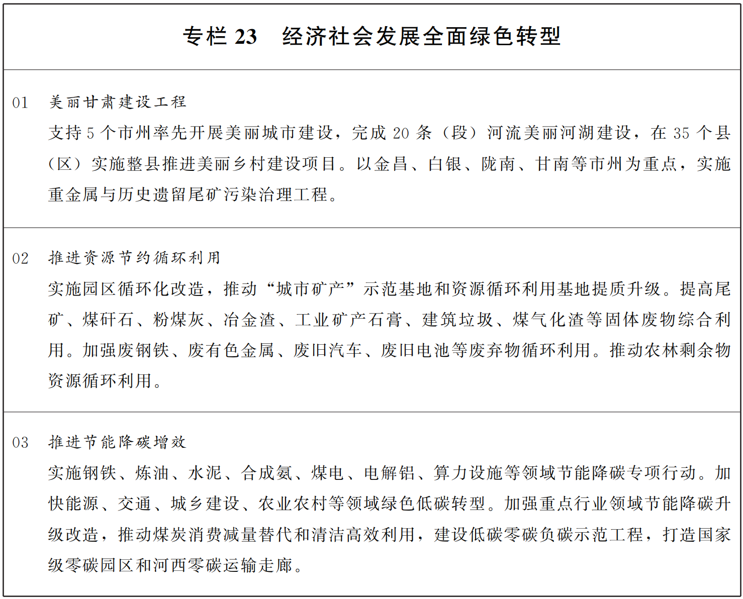 ——美丽甘肃建设水平明显提升。绿色生产生活方式加快形成,2030年前碳达峰目标如期实现,单位地区生产总值二氧化碳排放持续降低、非化石能源占能源消费总量比重持续提高,清洁低碳安全高效的新型能源体系初步建成,主要污染物排放总量持续减少,森林覆盖率提高到13.52%,生态环境全面改善,生态系统多样性、稳定性、持续性逐步提升,国家西部生态安全屏障更加牢固。