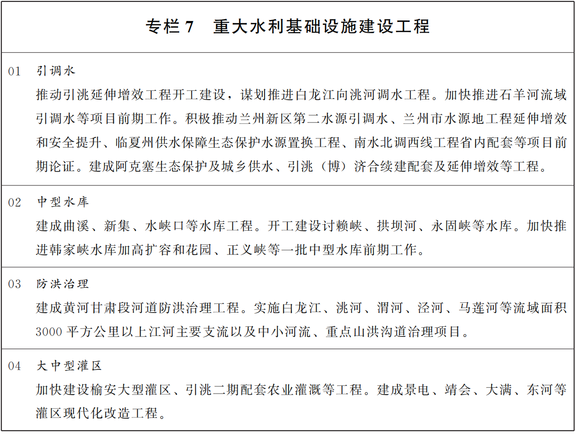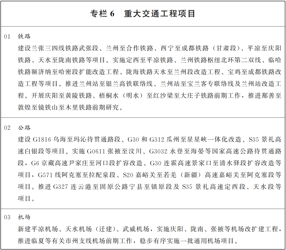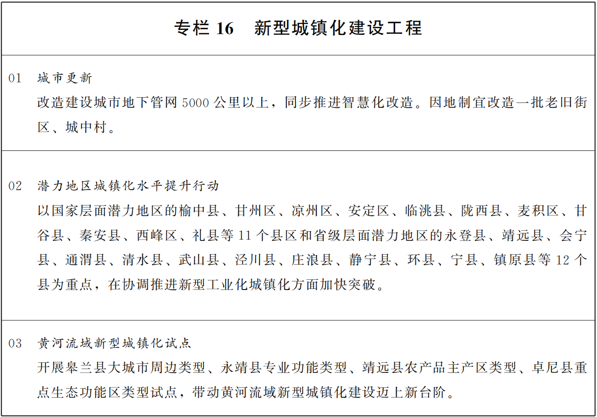 基础设施建设跃上新台阶。综合交通体系建设成效显著,中兰客专、兰张三四线中武段、酒额铁路等建成通车,兰合铁路、西成铁路、兰张三四线武张段、平庆铁路、天陇铁路加快建设,新增铁路里程639公里;“三大高速公路新通道”和“甘川新通道”项目开工建设,新增通高速县市15个,新增高速和一级公路2600公里;兰州中川机场三期、嘉峪关酒泉机场改扩建、华池通用机场建成运营,航空旅客吞吐量超过2100万人次。水利建设润泽陇原,水网规划体系逐步完善,引洮二期骨干及城乡配套工程、甘肃中部供水等一批骨干水网、民生水利工程建成通水,景电灌区现代化改造、阿克塞生态保护和城乡供水等工程开工建设,新增工程供水能力9.83亿立方米。能源建设突飞猛进,电力总装机达到1.24亿千瓦、是2020年的2.2倍,新能源装机8042万千瓦、年发电量963亿千瓦时,分别是2020年的3.4倍、2.5倍,新能源装机、发电量占比分别达到64.6%、37.4%,均居全国前列,陇电入鲁外送工程建成投运,陇电入浙外送工程全面开工;煤炭产能、产量分别增加4749万吨/年、2751万吨;建成陇东千万吨油气生产基地,原油、天然气产量分别增加301.9万吨、5.5亿立方米。新基建扩面增效,“双千兆”网络实现乡镇以上区域全覆盖、5G网络覆盖95%以上行政村,庆阳数据中心集群智能算力规模达到11.4万P,在全国八大枢纽节点中算力增速最快、智算占比最高、消纳最充分。