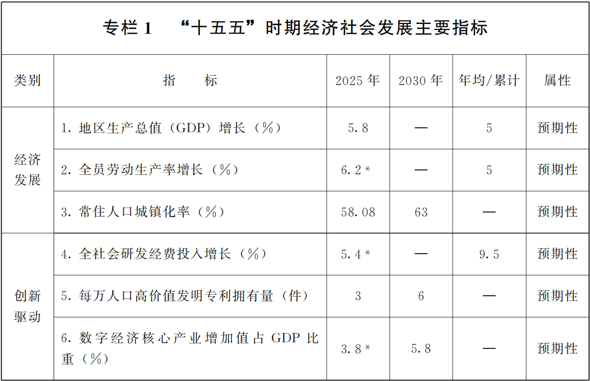 锚定到2035年基本实现社会主义现代化远景目标,坚定信心、跳起摸高、追赶进位,“十五五”时期经济社会发展努力实现以下主要目标: