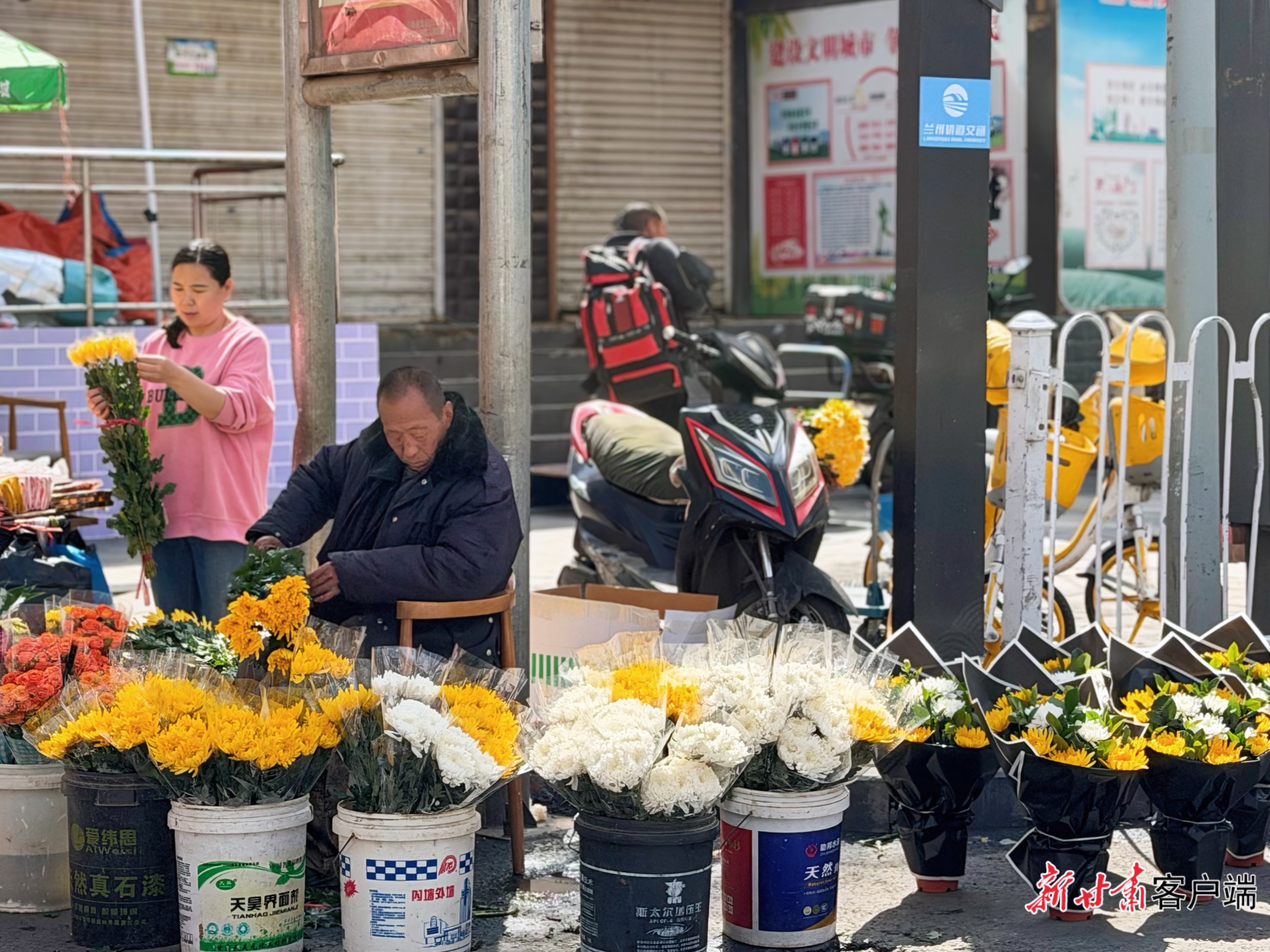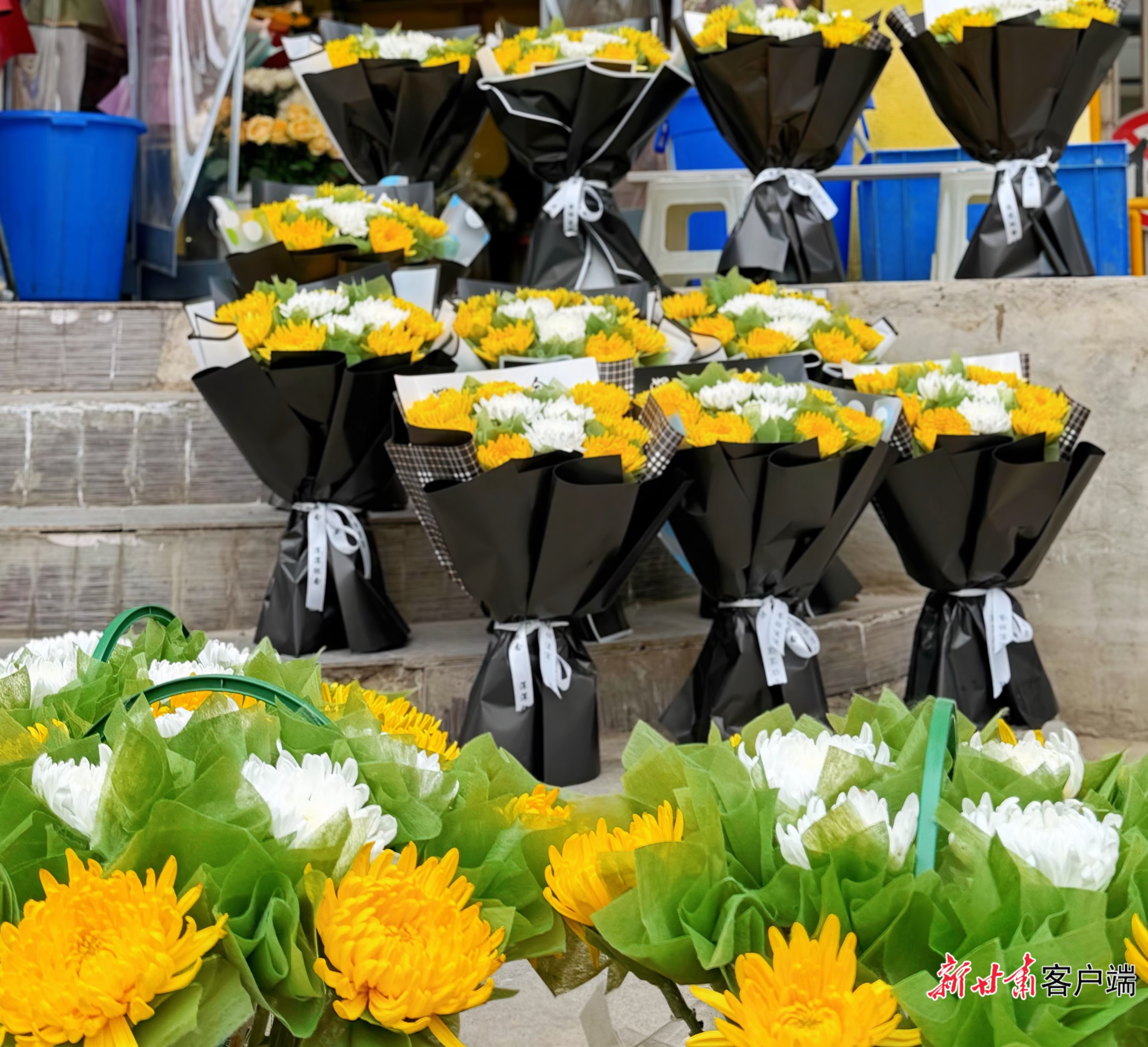 记者在城关区秦安路一家花店看到,新鲜的黄菊、白菊被整齐地码放在店门口,店主正忙着搭配花材、扎制花束。不时有市民前来购买,以一束清菊、一只花篮,寄托对先人的思念。