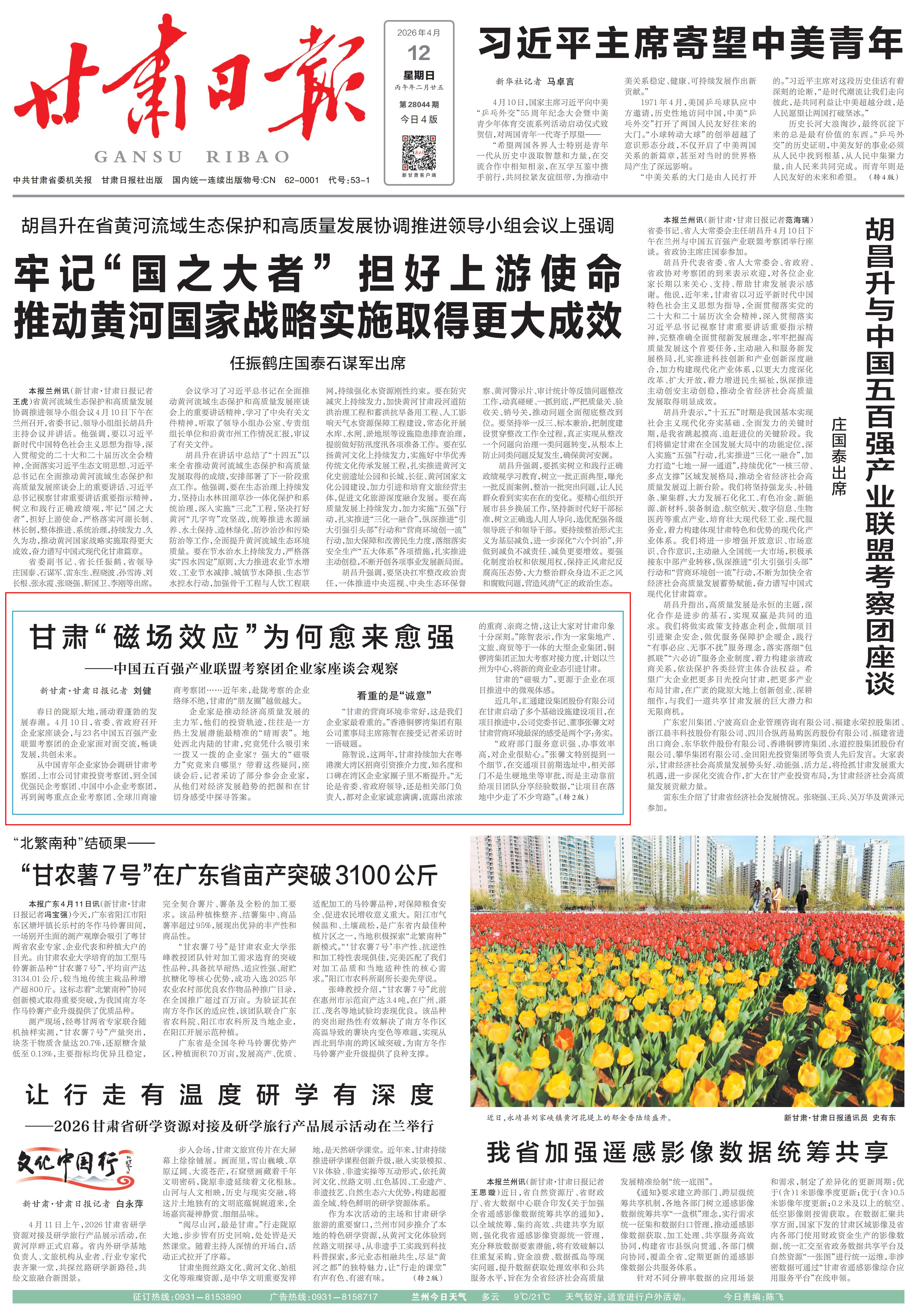 4月10日,省委书记、省人大常委会主任胡昌升在兰州与中国五百强产业联盟考察团举行座谈。新甘肃·甘肃日报记者 孟捷