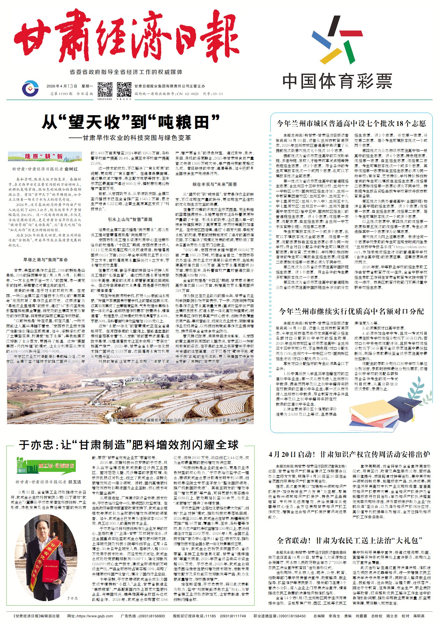 作为挺立在农业战线的排头兵,甘肃省农业科学院副院长杨天育表示,下一步,该院将持续推动旱作农业节水高质量发展;重点攻坚中低产田土壤改良技术,打造水肥一体化高效种植模式;研发寒旱区作物抗旱高产核心技术,创新绿色覆盖农用产品;集成智能化、机械化农业技术,研制精准作业农机装备,以科技创新赋能旱作农业提质增效,持续筑牢全省粮食安全防线。
