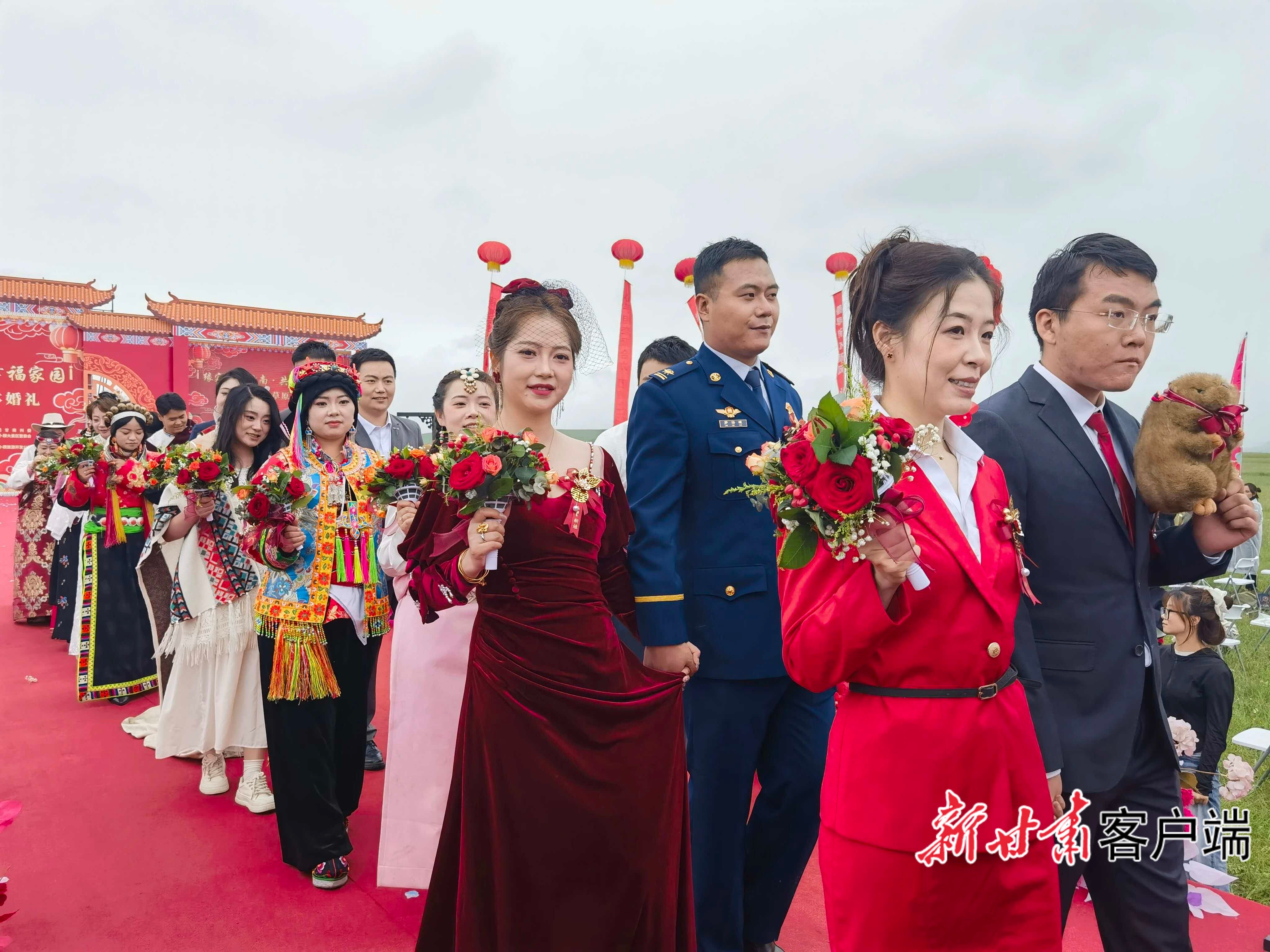 除了搭建交友平台,我省还以集体婚礼为抓手,倡导婚事简办新风尚。2025年5月20日,“礼赞劳动美·执手绘新篇”甘肃省百对职工集体婚礼在平凉市举行。崆峒山下、泾河之滨,80对新人、14对劳模代表和12对金婚代表身着盛装,在500多名亲朋好友的见证下,手执红绸踏上红毯,许下相伴一生的誓言。