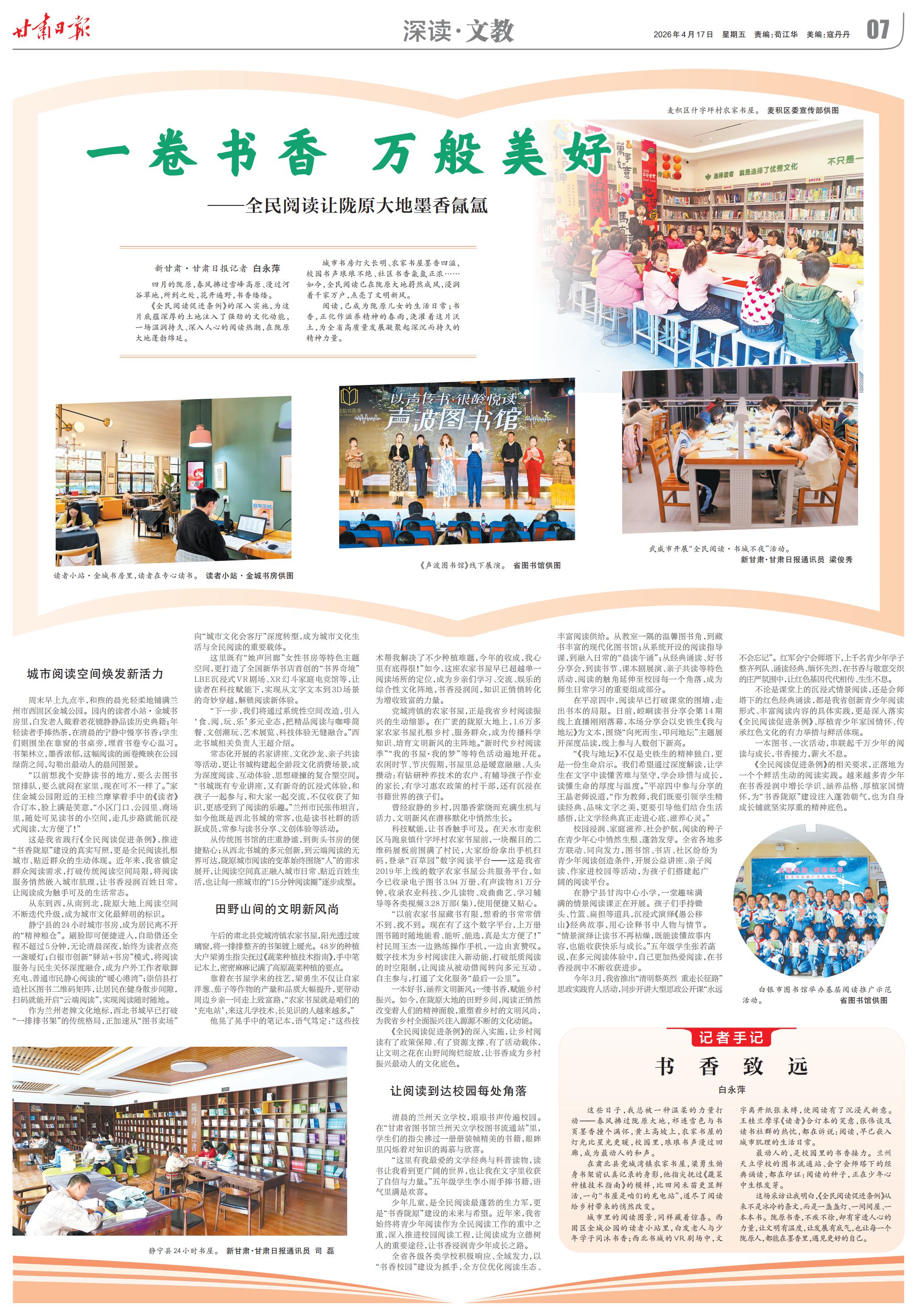 城市书房灯火长明、农家书屋墨香氤氲,校园书声琅琅不绝、社区书香氛围正浓……如今,全民阅读已在陇原大地蔚然成风,浸润着千家万户,点亮了文明新风。