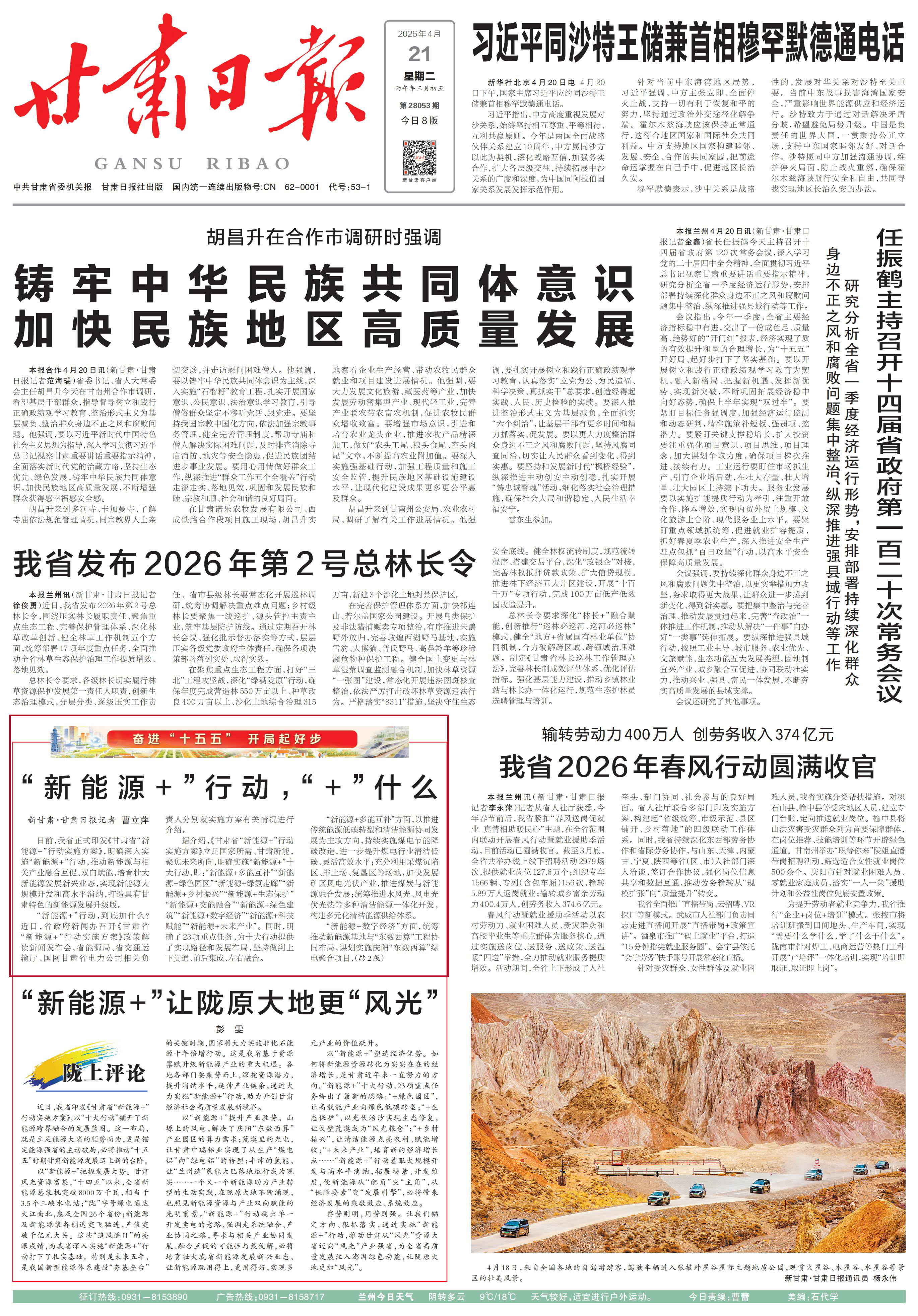 “按照省委、省政府的安排部署,为加快国家有关政策贯彻落实,我们抢抓历史机遇,从加快推进能源强省建设的战略高度,统筹结合产业基础和新能源资源优势,制定《甘肃省“新能源+”行动实施方案》,聚力推动新能源与相关产业“双向赋能”,为“十五五”时期推动全省新能源发展再上新台阶提供了行动指南。”省能源局相关负责人介绍。